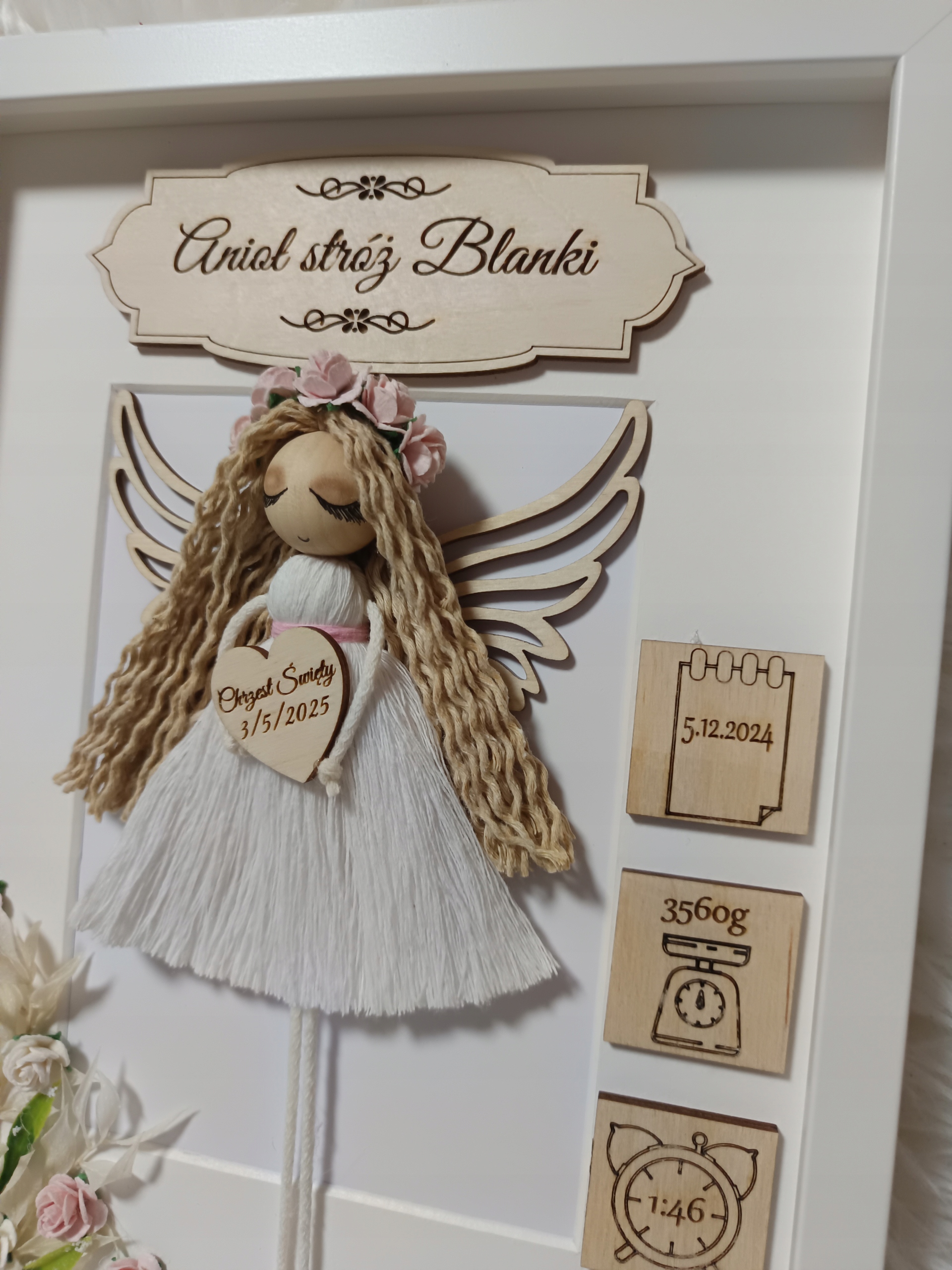 Ангел виготовлений вручну з бавовняної струни найкращої якості. Рамка може бути унікальним подарунком для хрещення, дня народження, святого Причастя. Це красиво прикрасить кімнату кожного дитячого. Він містить найважливіші дані з дня народження, сувенір протягом багатьох років.