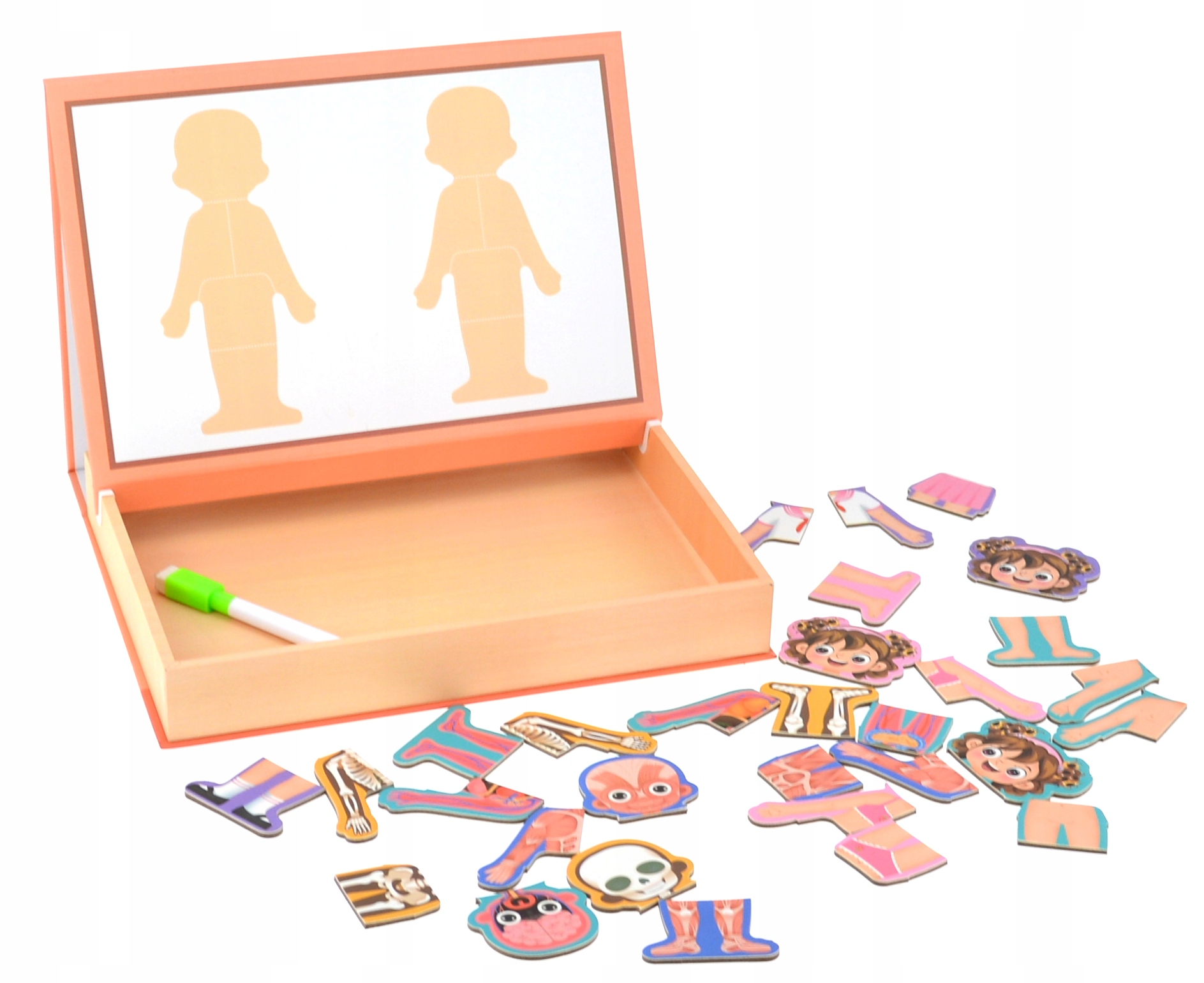 Магнітний пазл «Тіло дівчинки» — навчальний набір, який дозволить найменшим дітям дізнатися про будову та функціонування людського тіла. Гра містить головоломки, які крок за кроком розкривають таємниці людського тіла: скелет, органи, шкіру.