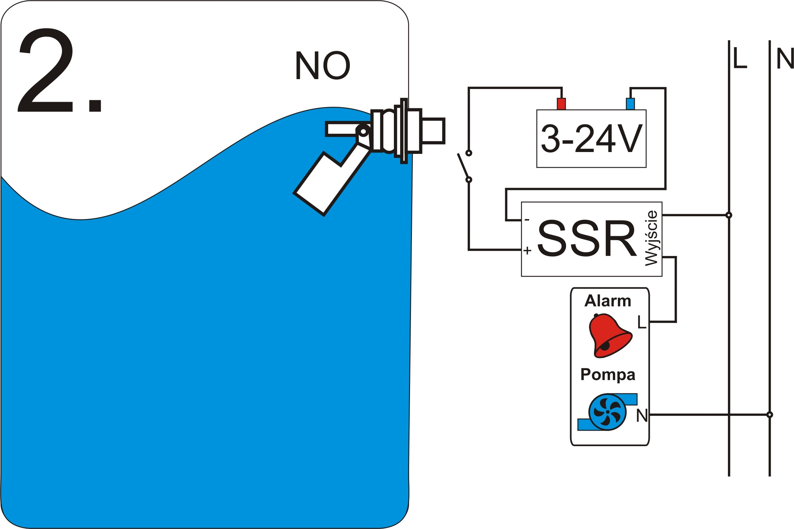 - Безпечна напруга, що живить реле SSR і поплавок (можливість використання напруги в діапазоні: 3–24 В постійного струму),