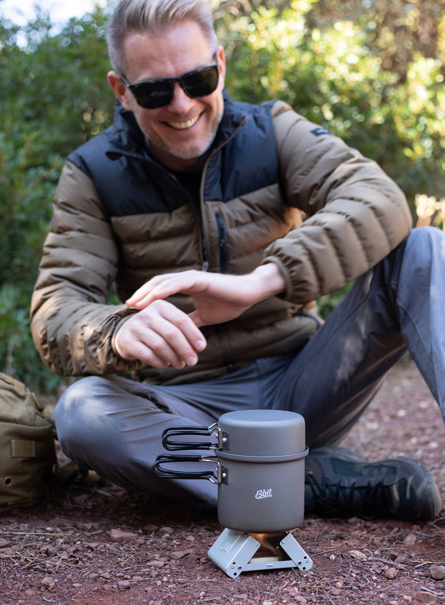 Кожна ручка також покрита силіконовим покриттям, яке покращує властивості проти ковзання та захищає руки проти високих температур. Горщик більшого розміру, що входить до туристичного набору Esbit Aluminium Pot 1000, має чітку шкалу об’єму в мл та унціях, що дозволяє точно вибрати пропорції. Все це розміщено в легкому чохлі з синтетичної сітки.