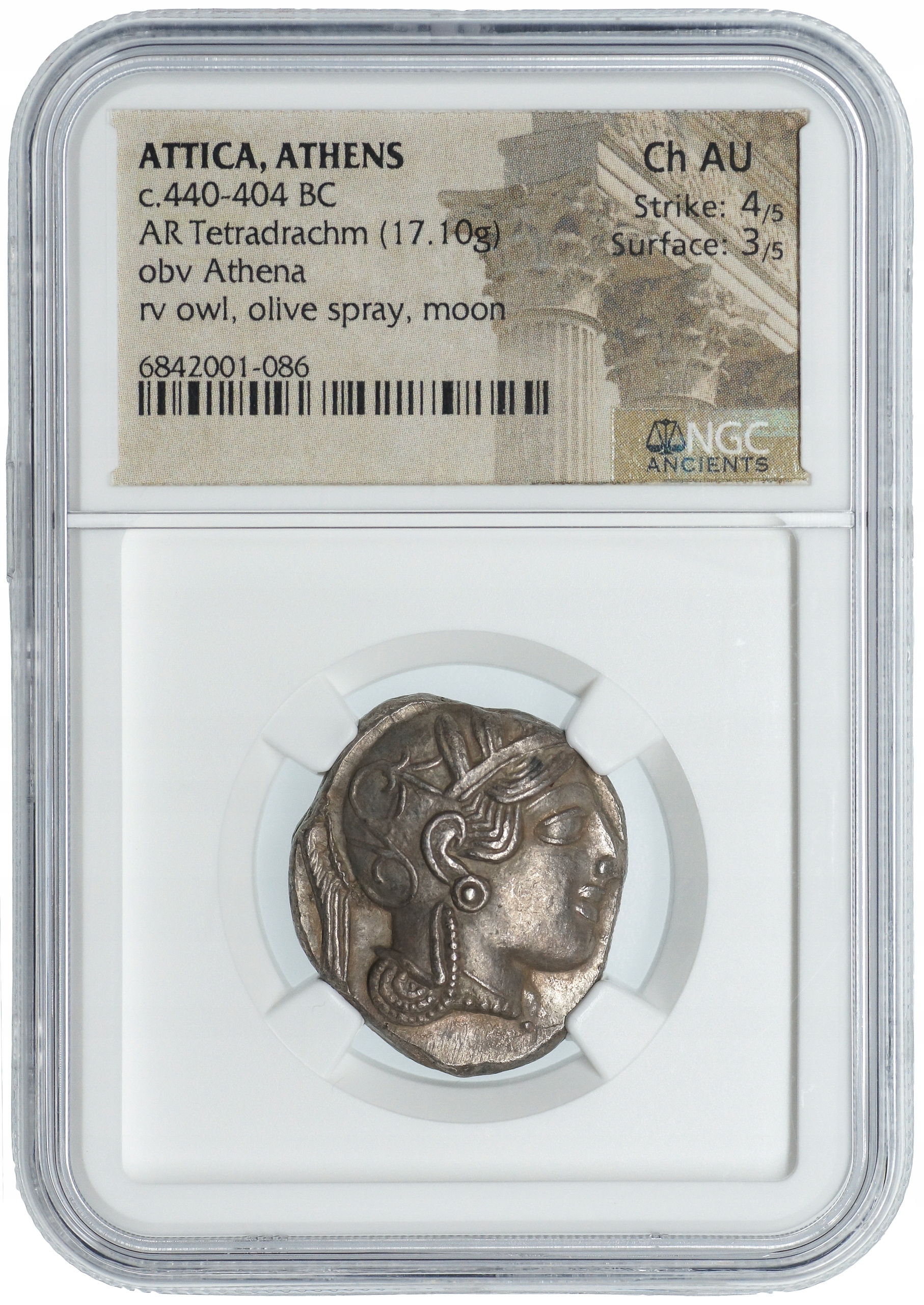 Екземпляр походить із періоду Золотого віку Афін – часу розквіту культури, архітектури та торгівлі, коли Афіни стали центром грецького світу. Тетрадрахми цього періоду були не лише засобом платежу, а й символом могутності полісу.