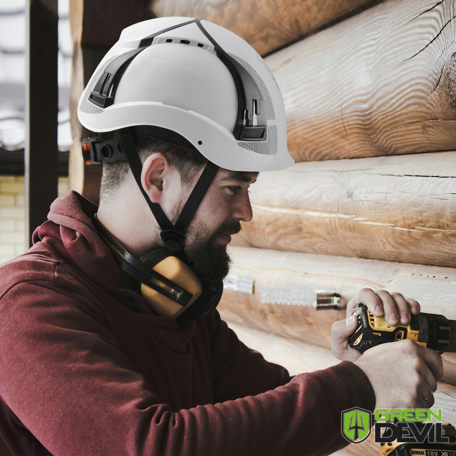 - Сертифікати: ANSI Z89.1 Тип 1, клас C, EN 397 - підходить для будівництва, столярних виробів, лісових господарств, лісів та роботи на висоті.