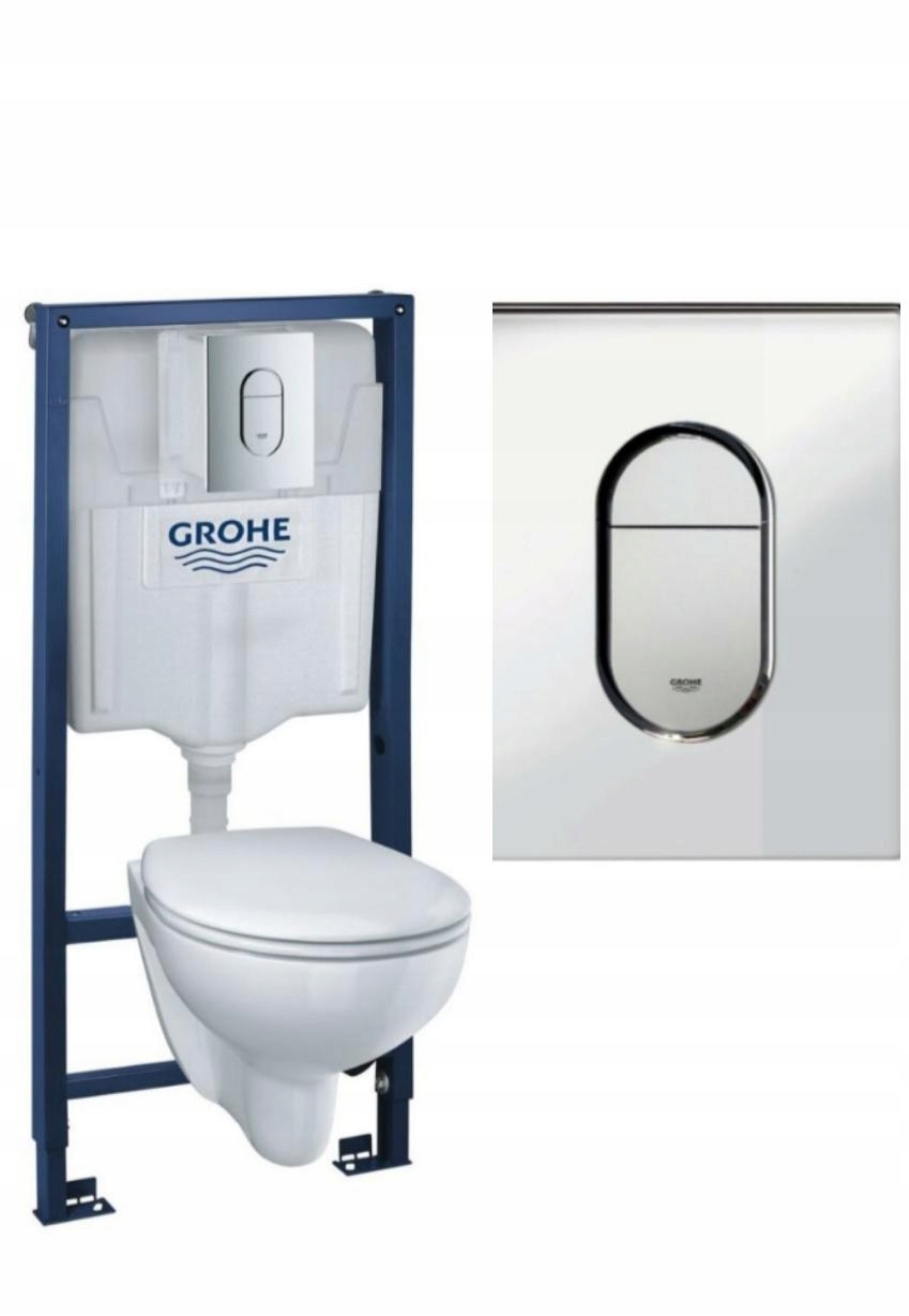 ПОВНИЙ КОМПЛЕКТ УНІТАЗУ GROHE SOLIDO З ХРОМОВОЮ КНОПКОЮ ARENA ТА ПІДВІСНОЮ ЧАШОЮ GROHE RIFFLE ІЗ СИДІННЯМ З ДЮРОПЛАСТУ, ЩО ПОВІЛЬНО ЗАКРИВАЄТЬСЯ