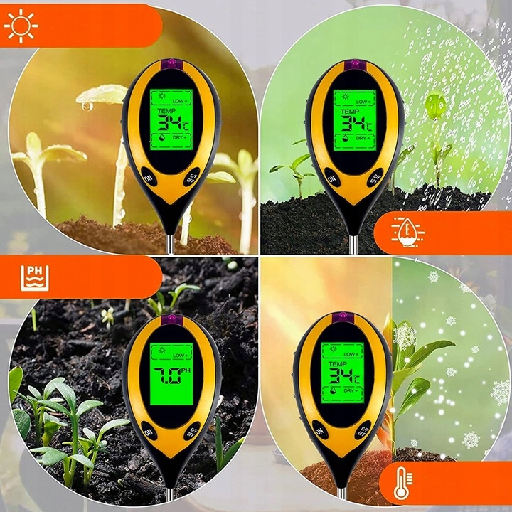 - Кисломір 4 в 1 із функціями вимірювання вологості ґрунту, температури та сонячного світла