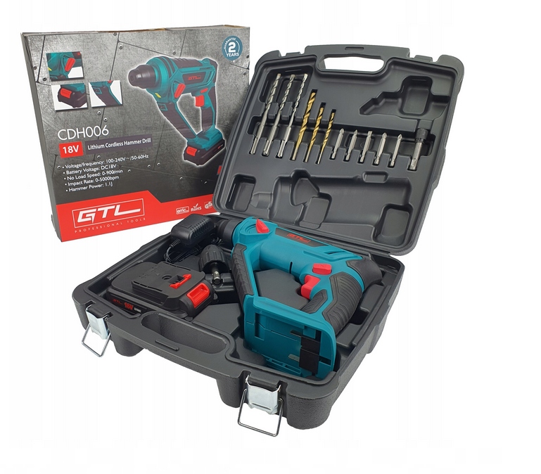 Акумуляторна дриль GTL CDH006 має свердлильний патрон SDS+, який гарантує, що дриль не розб'ється під час роботи, і в той же час забезпечує більшу безпеку використання. У набір входить регульована свердлильна головка, яка дозволяє перетворити пристрій на повноцінну викрутку. Перемикач напрямку, який використовується в пристрої, можна використовувати при загвинчуванні та викручуванні різних типів шурупів.