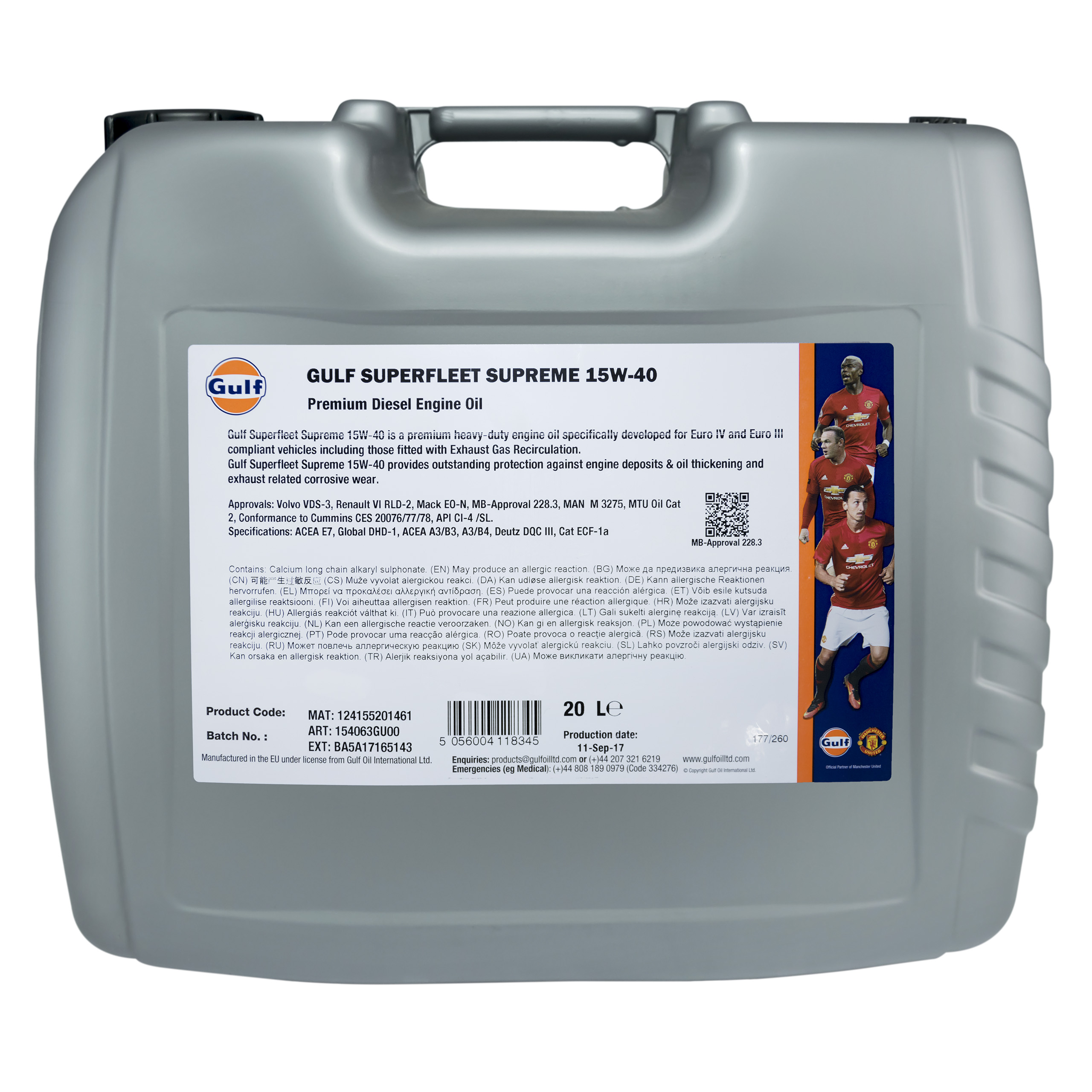 GULF SUPERFLEET SUPREME 15W40це високоефективна олива для важких дизельних двигунів, розроблена спеціально для використання в сучасних дизельних двигунах з низьким рівнем викидів, включаючи двигуни, обладнані системою рециркуляції вихлопних газів (EGR). Gulf Superfleet Supreme 15W40 відповідає останнім вимогам, встановленим усіма основними європейськими, американськими та японськими виробниками двигунів, і забезпечує винятковий захист і підвищену довговічність для дизельних двигунів, що працюють на паливі з низьким або високим вмістом сірки. Gulf Superfleet Supreme 15W40 являє собою суміш відібраних масляних основ і технологічно передових збагачувальних присадок нового покоління.