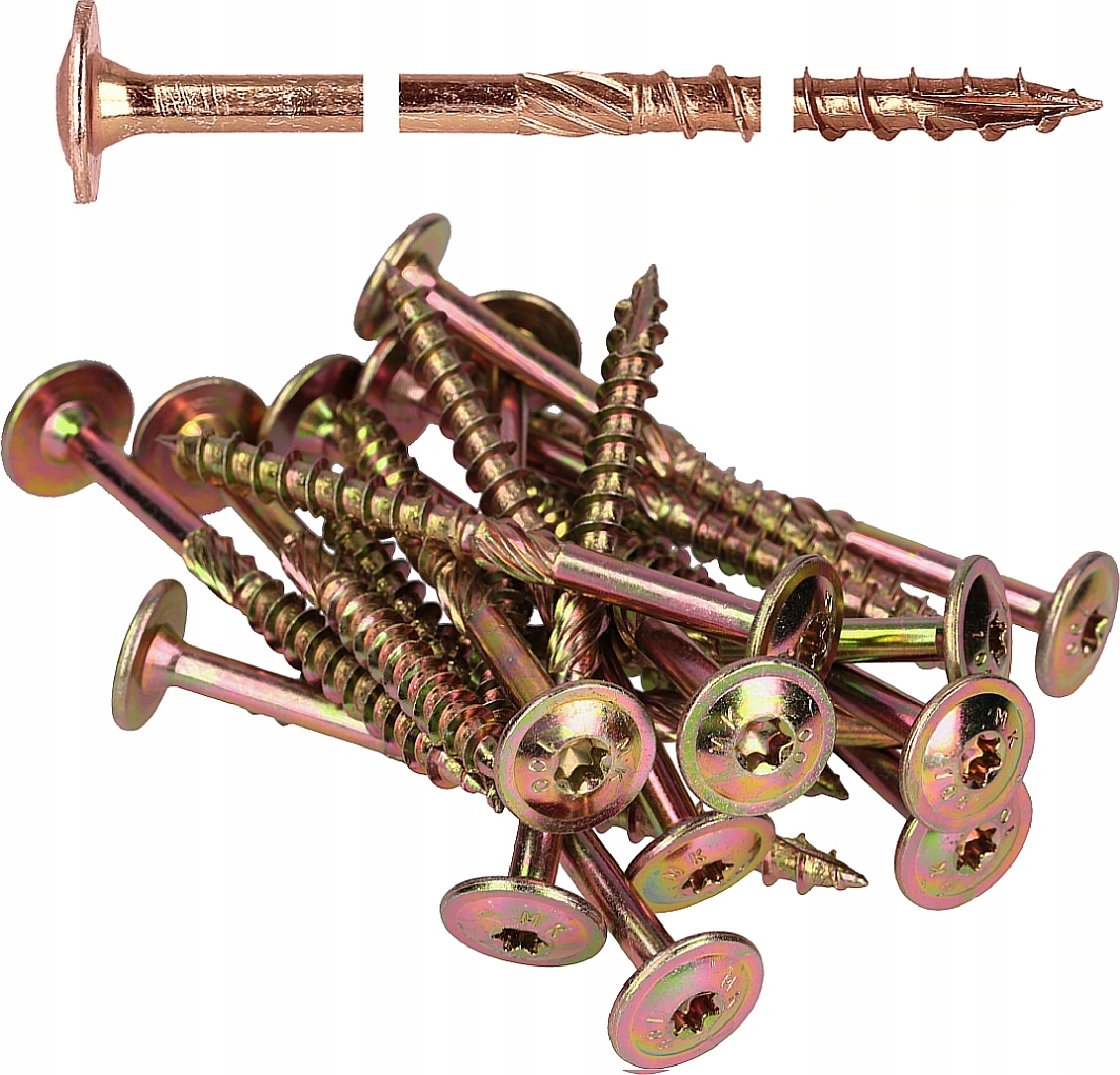 ШУРУПИ TORX CARPENCY, ПЛАСТИЧНА ГОЛОВКА - мають спеціальне лезо - насічку на початку різьби, яка полегшує початок загвинчування та запобігає розтріскування деревини. Крім того, шурупи мають спеціальні нарізні насічки на різьбі, які під час вкручування розрізають волокна деревної конструкції. Розширювальний різець зменшує крутний момент, необхідний для загвинчування, розширюючи отвір, а дискова головка збільшує поверхню тиску, забезпечуючи високу силу втягування та закриваючи з’єднання. Ще однією перевагою є спеціальне воскове покриття, яке наноситься в процесі виробництва, що значно знижує момент закручування. Це робить установку швидшою, легшою та зменшує енергоспоживання, що особливо важливо для інструментів з акумуляторним живленням.
