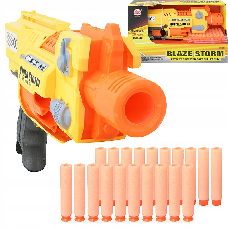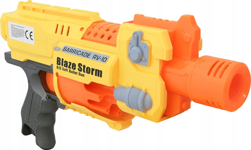 Модель Barricade RV-10 — потужна зброя для спеціальних завдань. Має поворотний магазин на 10 дротиків. Завдяки цьому ви завжди будете готові до зйомки. Blaze Storm працює від батареї, завдяки чому м’які та делікатні кулі летять далі та точніше. У набір входить цілих 20 стріл. 10 стріл закінчуються присоскою, а друга половина - гирою, що збільшує дальність польоту. Завдяки двом видам амуніції ми можемо організовувати різні ігри, наприклад, стрільбу по мішені. Гвинтівка має заслінку, яка відсувається зверху, що дозволяє вийняти застряглу кулю в стволі. Вся справа виконана в чітких кольорах, які підвищать видимість під час зйомки.