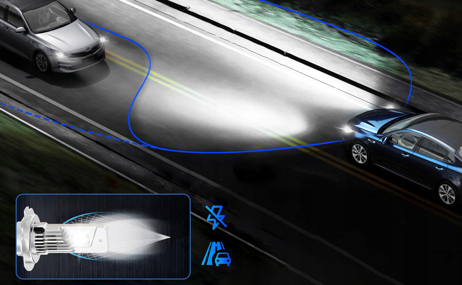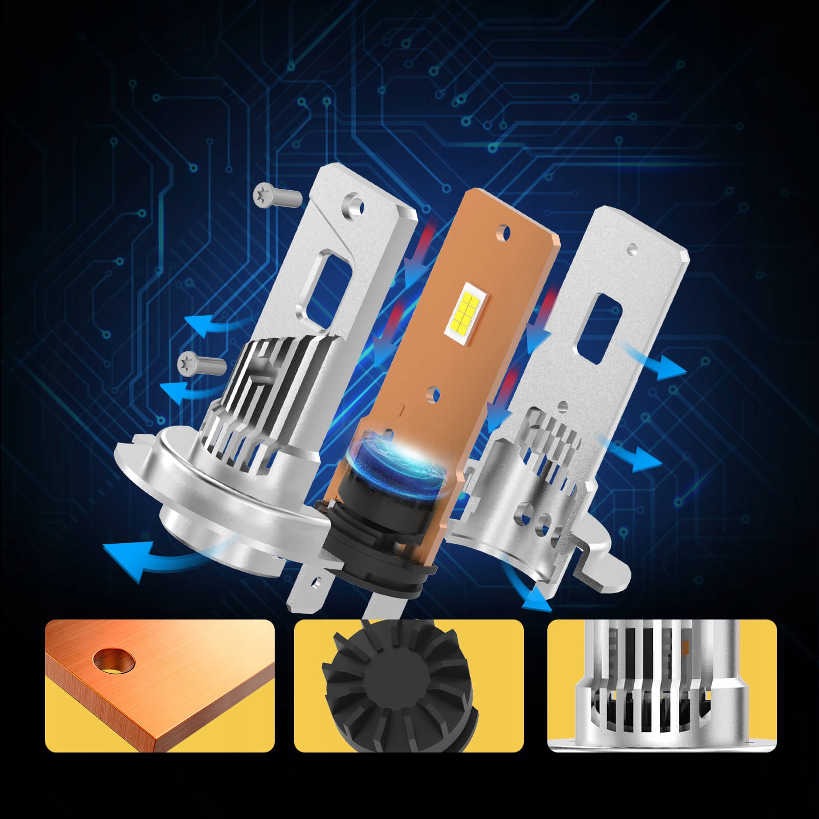 Інтелектуальнадвоступенева система охолодження, керована чіпом, з радіатор, висока ефективність, відсутність радіоперешкод FM/CB і відсутність ефекту вигоряння, як у випадку з ксеноновими нитками розжарювання та традиційними галогенними лампочками.