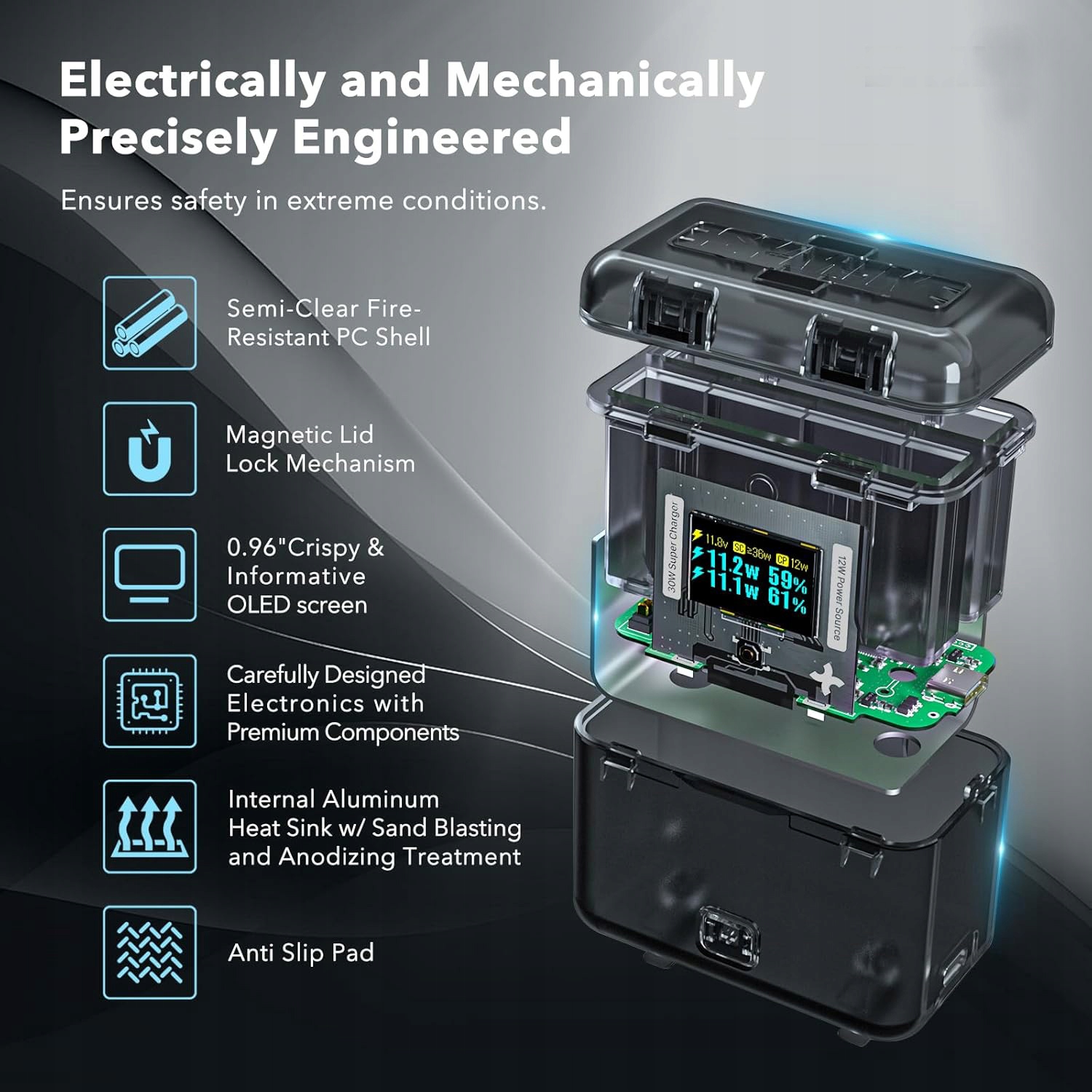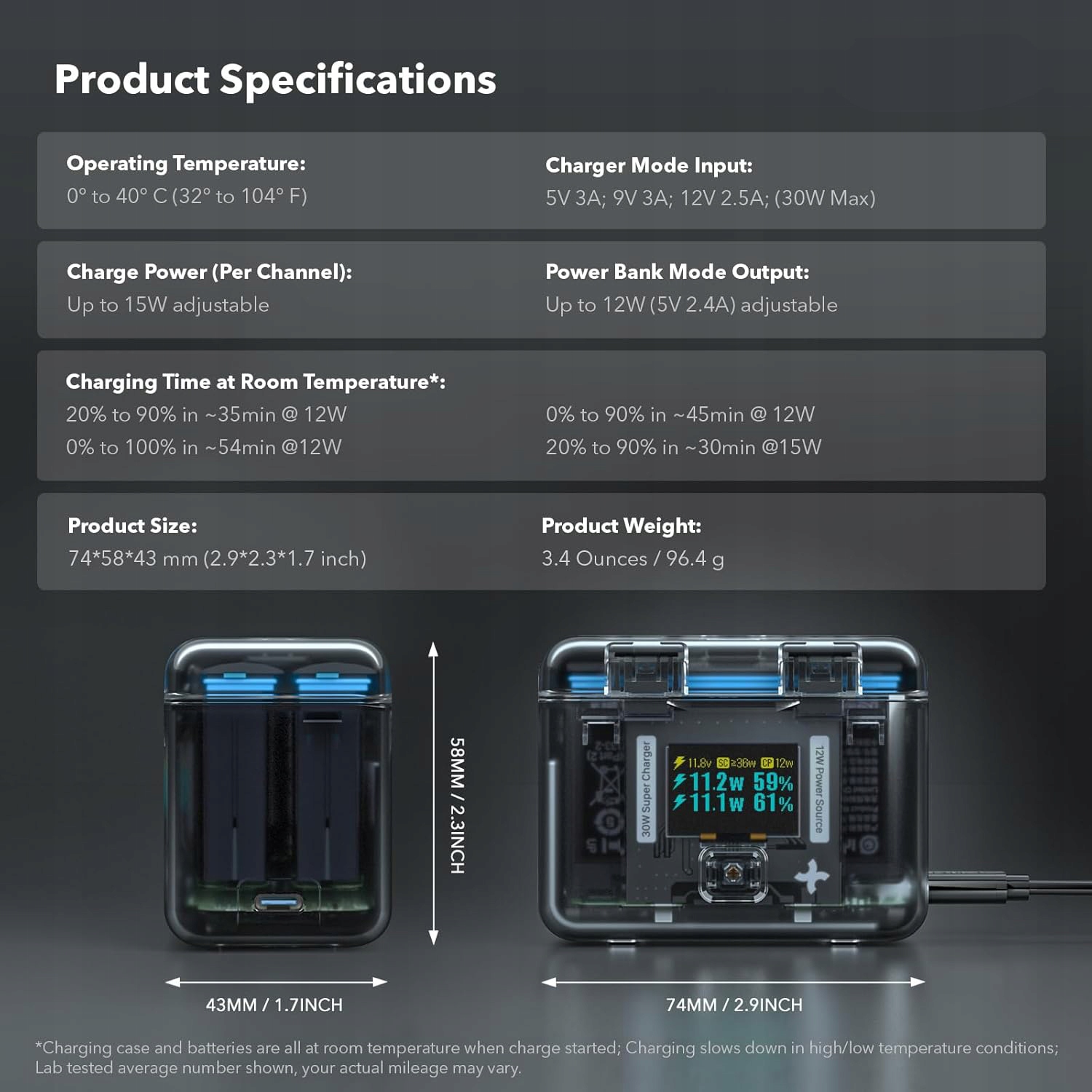 Розумний зарядний футляр 3-в-1: двоканальна станція швидкого заряджання потужністю 30 Вт, вихідне джерело живлення потужністю 12 Вт і футляр для зберігання акумулятора. 3 функції в одному пристрої. Швидка зарядка акумуляторів X4 до 15 Вт на канал (всього 30 Вт); Спеціальний режим виходу розряджає батареї X4 послідовно, щоб зарядити маленький пристрій, коли це необхідно; Безпечно зберігайте свої акумулятори X4, не турбуючись про їх розрядку.