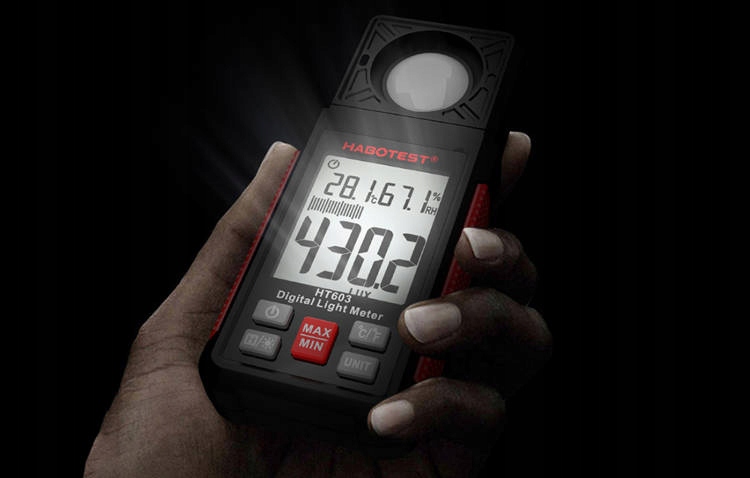 Habotest HT603 використовується для вимірювання інтенсивності світла в діапазоні 0~100000 LUX / 0~10000 FC. Це корисно в таких сферах, як електротехнічна промисловість або для перевірки приміщень. Відрізняється коротким часом відгуку, а обертовий щуп підвищує зручність використання. Крім того, за допомогою приладу можна виміряти рівень вологості та температуру навколишнього середовища. Крім того, HT603 живиться від 3 батарейок типу ААА.