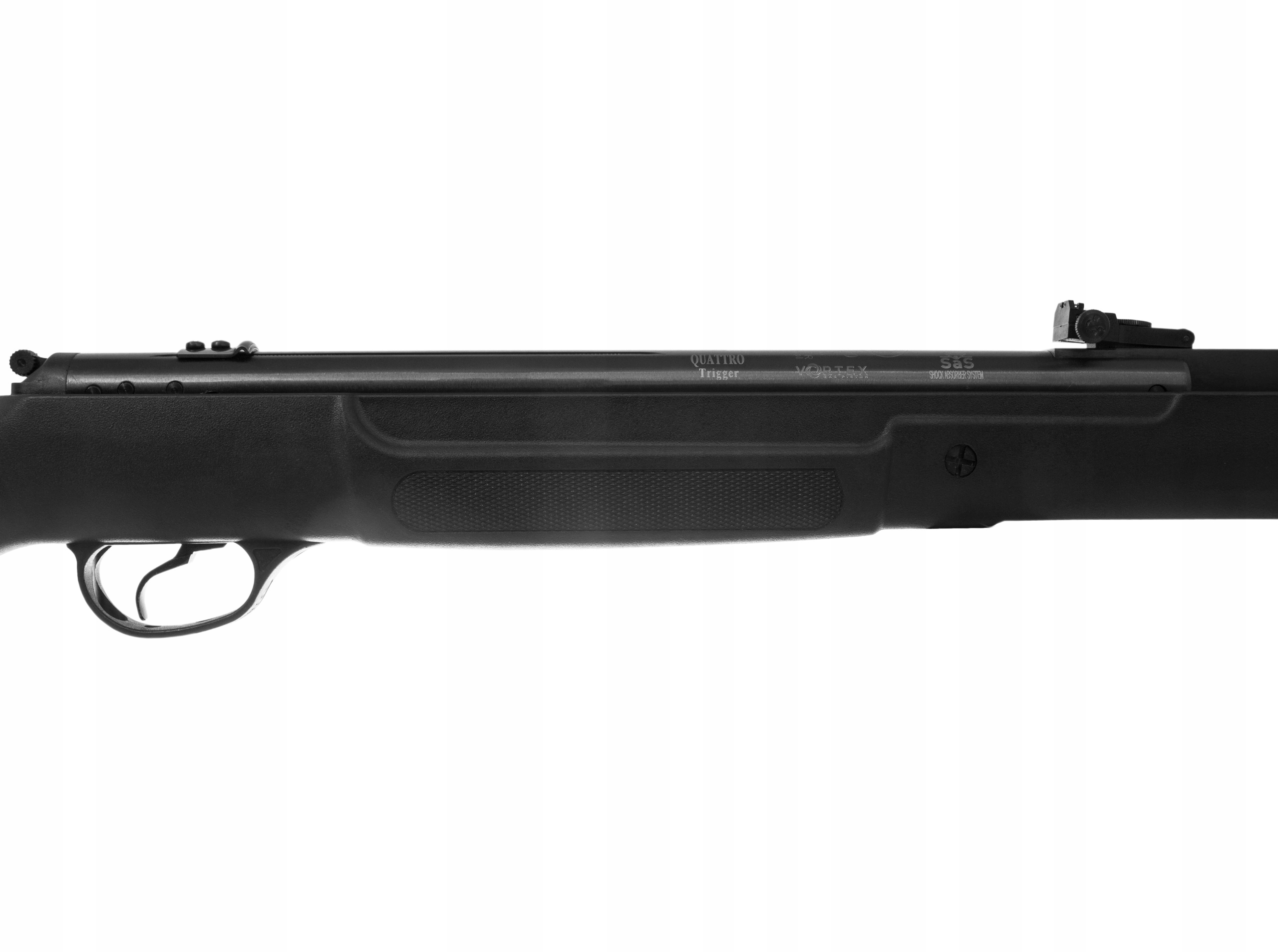 Hatsan 90 STG Vortex 5,5 мм – міцна пружинна рушниця з ергономічним полімерним прикладом, газовою пружиною Vortex, регульованим ударно-спусковим механізмом Quattro та системою зменшення віддачі SAS.