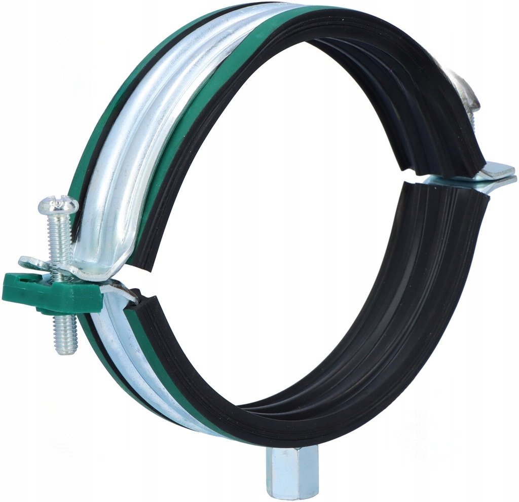 Хомутик з двома гвинтами, матеріал: сталь, електрооцинкована, звукоізоляційна підкладка, EPDM, чорно-зелена, підкладка стійка до старіння Можливість закриття затискача однією рукою - механізм швидкого закриття, шумозаглушення відповідно до DIN 4109 , завдяки підкладці EPDM, оптимальний діаметр затискача коливається від 10 - 225мм, покращена геометрія, підкладка ідеально прилягає до затискача, не рухається