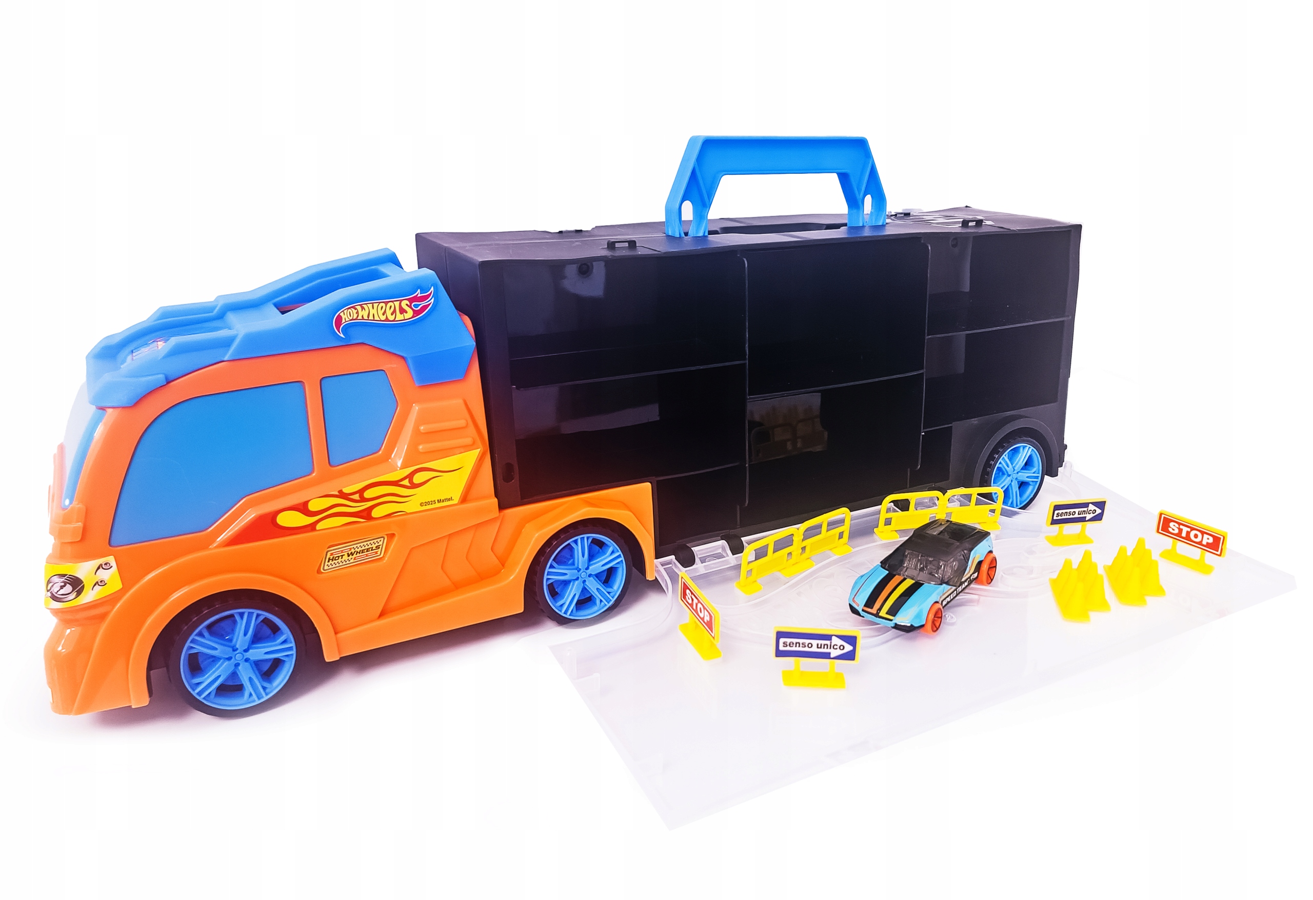 Транспортер Hot Wheels для хлопчиків. Захоплені швидкими автомобілями зможуть помістити всю свою колекцію автомобілів Hot Wheels у цю оранжево-чорну вантажівку. Транспортер має вбудовану рампу, яка подарує захоплюючі враження. У набір входять дорожні знаки, які урізноманітнюють веселощі. Ця вантажівка порадує кожного маленького шанувальника автомобілів.