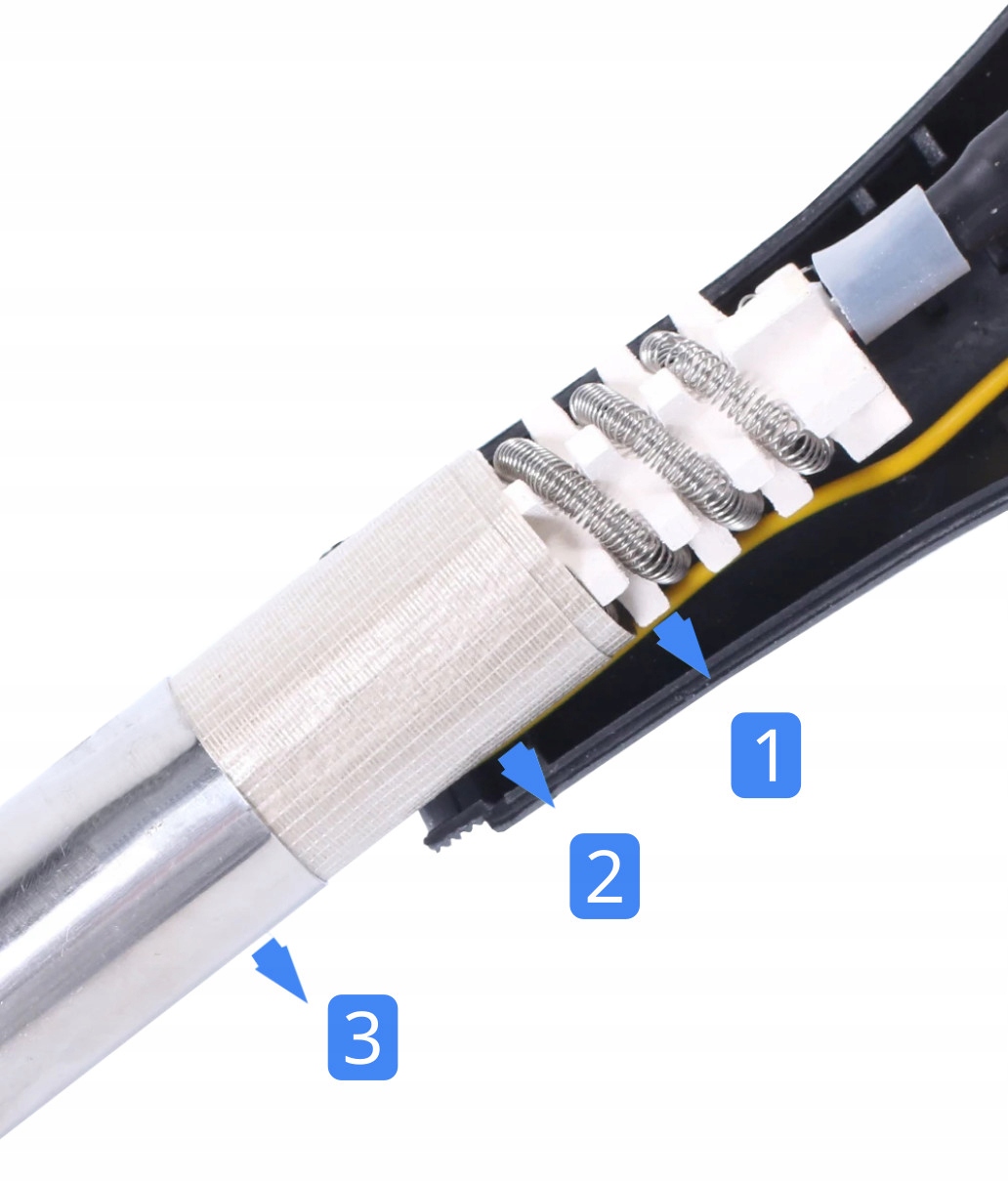 У колбі є нагрівальний елемент на керамічному скелеті, побудований з товстого дроту, покритого Міком, який захищає від випадкового короткого замикання з корпусом. Нагрівач гарантує миттєве нагрівання до встановленої температури, що забезпечує ефективну роботу з електронними елементами та зручним зварюванням пластмас.