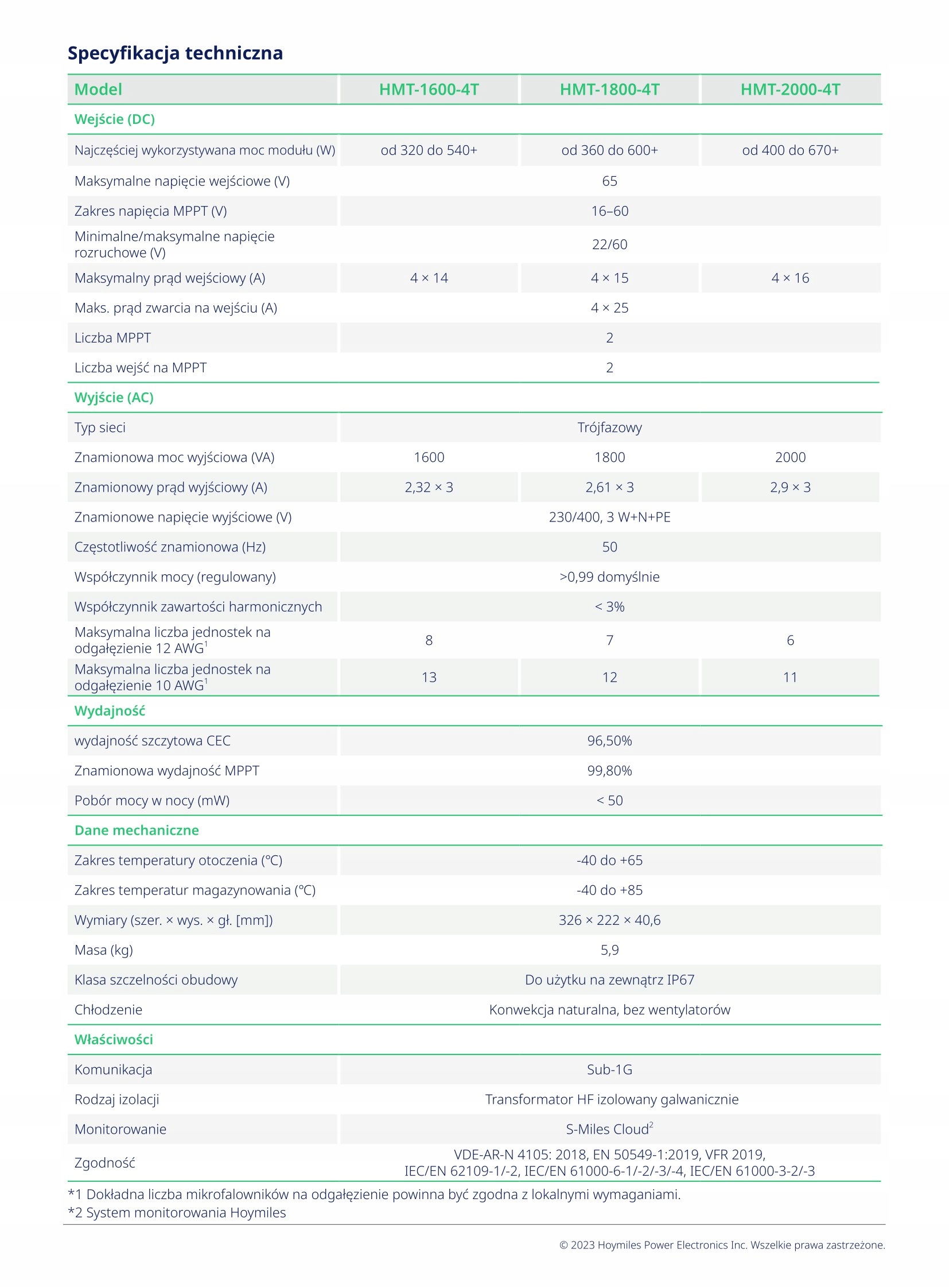 Нове покоління Hoymily Hoymile Microinwerers було розроблено для сонячних модулів високої потужності, з урахуванням максимальної потужності виходу до 2000 ВА та максимального вхідного струму постійного струму до 16 а. Це дозволяє швидше встановити та меншу вартість, і робить серію HMT-20000 дуже вигідним вибором.