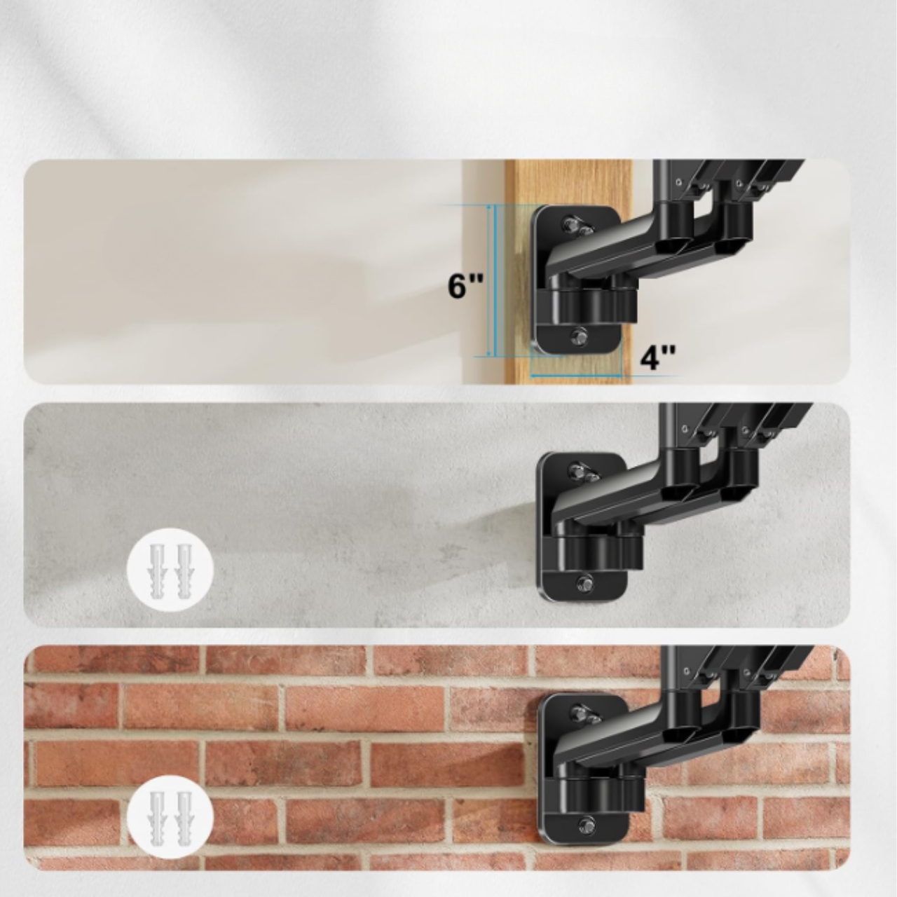 Ручка відповідає більшості моніторів 17–32 ″ з кріпленням VESA 75 × 75 або 100 × 100 мм . Набір включає всі необхідні елементи кріплення та розбірні інструкції. сумісність зі стінами, виготовленими з бетону, цегли або дерев’яних стовпів , дозволяє безпечно та постійне кріплення в різних просторах.