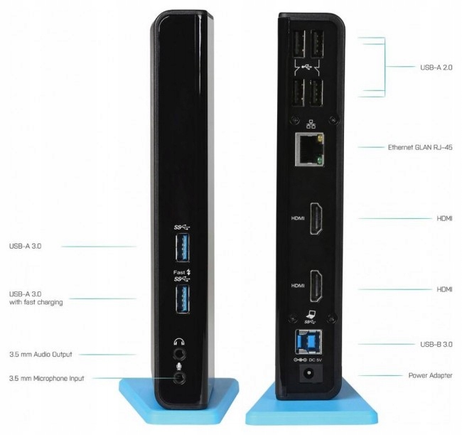 - роз'єми док-станції: 2 x USB 3.0, 1 x RJ-45, 1 x RJ-45 порт, 1 x miniJack 3,5 мм (навушники), 1 x miniJack 3,5 мм (мікрофон), 4 x USB 2.0, 1 x USB 3.0 типу B, 2 x HDMI