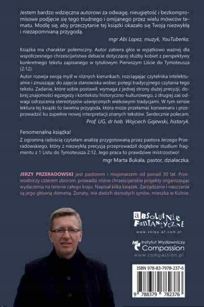 4 Фонд Eurohelp, цінує сміливе та продумане пояснення автора Один з найбільш суперечливих віршів Біблії, підкреслюючи, що книга це заклик до справедливості та рівності в церкві. 4 Аналіз теми, зазначивши, що читання книги може принести звільнення багато жінок у церкві.Марта Букая, пастор Церкви Буття у Варшаві та церковному лідері Вулиця, описує книгу як "феноменальну", підкреслюючи точну Аналіз складного фрагмента з 1 -го листа до Тимофія 2:12 та показ руйнівний вплив неправильних тлумачень на розвиток церкви.