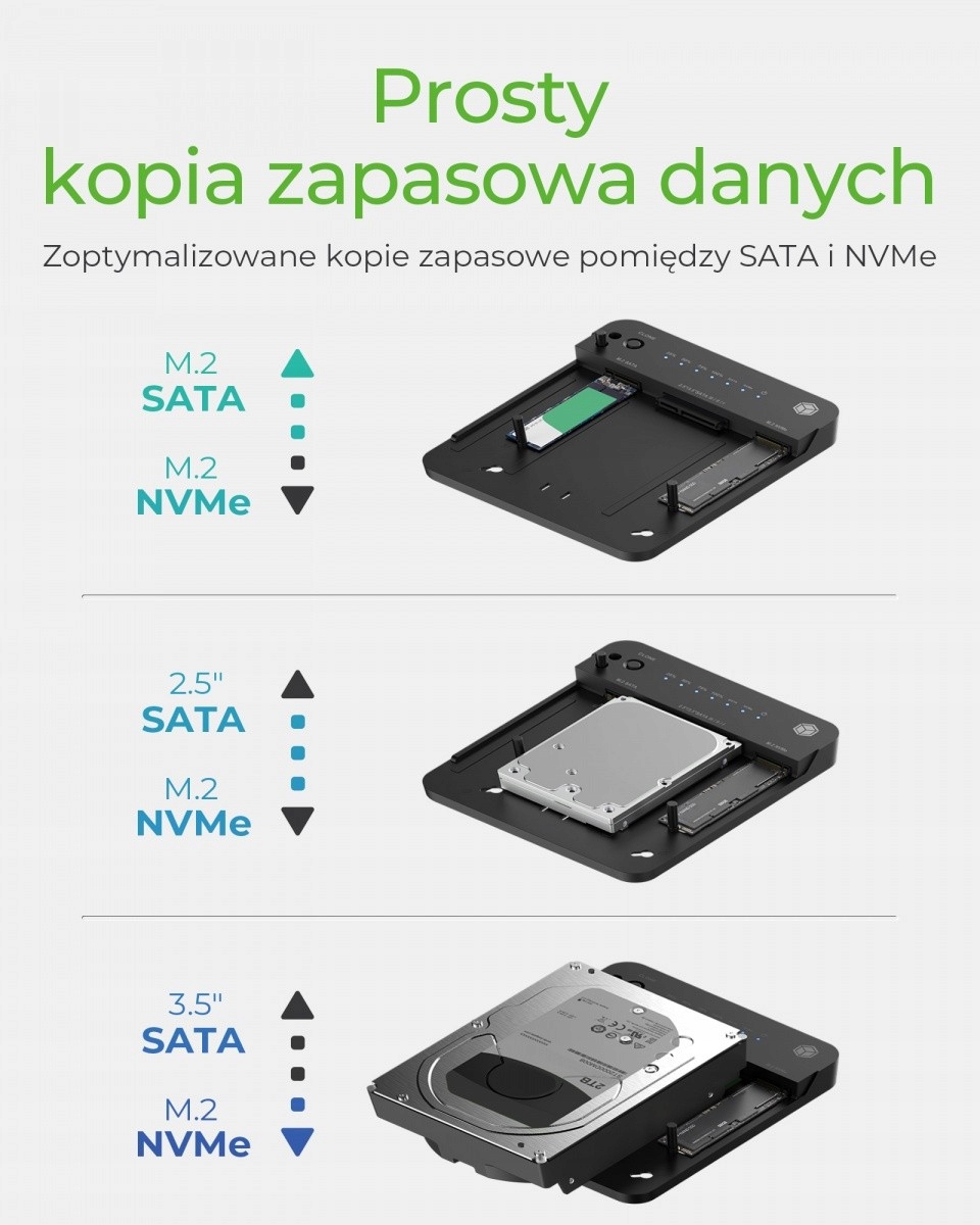 - Двонаправлене клонування: Клонуйте 2,5-/3,5-дюймовий SATA HDD/SSD на M.2 PCIe NVMe SSD або навпаки одним натисканням кнопки . Це забезпечує безпроблемне резервне копіювання даних або процес прискорення системи відповідно до ваших потреб.