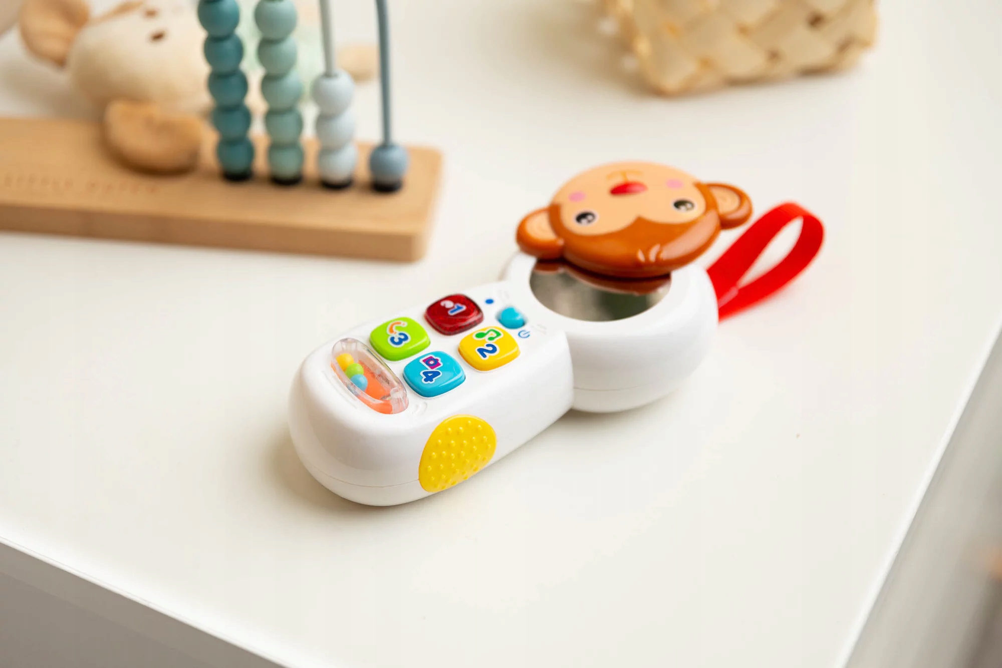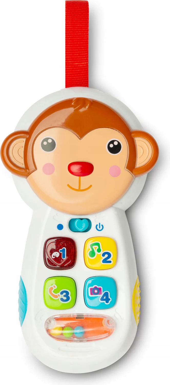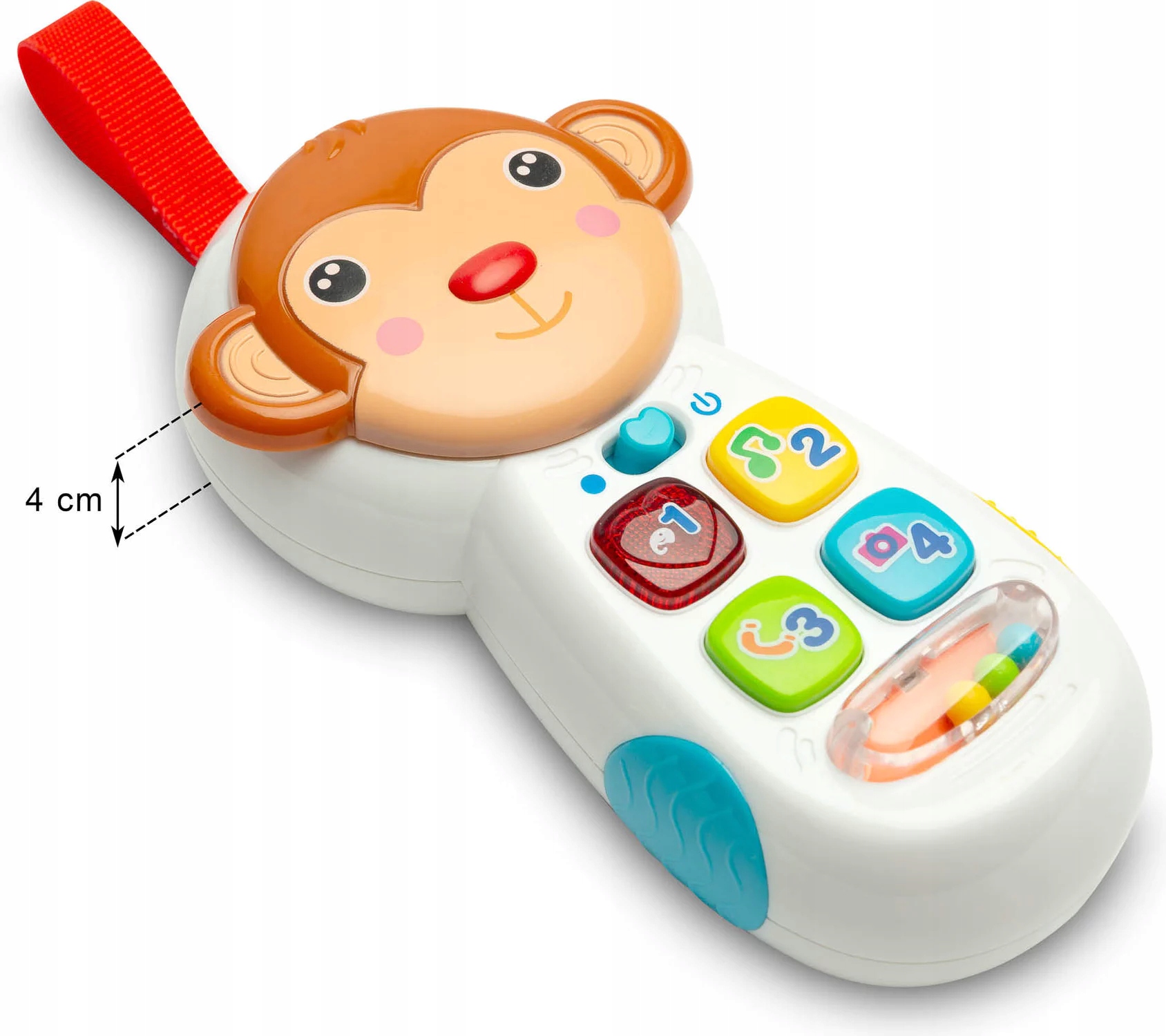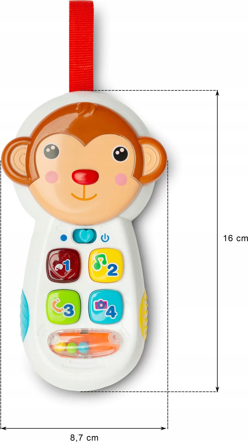 Телефонна мавпа іграшку від Caretero - це легка і зручна інтерактивна іграшка для немовлят та немовлят. Іграшка оснащена музичними кнопками, храпочкою з кульками та сяючою кнопкою. Крім того, телефон містить нахилене обличчя з прихованим дзеркалом і ремінцем на липучках, який дозволяє виправити його в інвалідному візку або колисці. Завдяки низькій вазі, дитина може легко підняти телефон. Іграшка стимулює почуття і розвиває уяву дитини. Продукт призначений для дітей віком 18 місяців.