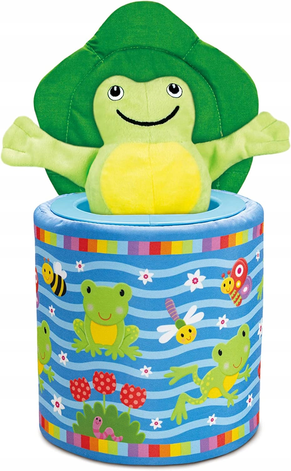 - М’яка, весела версія класичної іграшки «джек-у-коробці»! Підніміть кришку, і жаба вистрибне з коробки