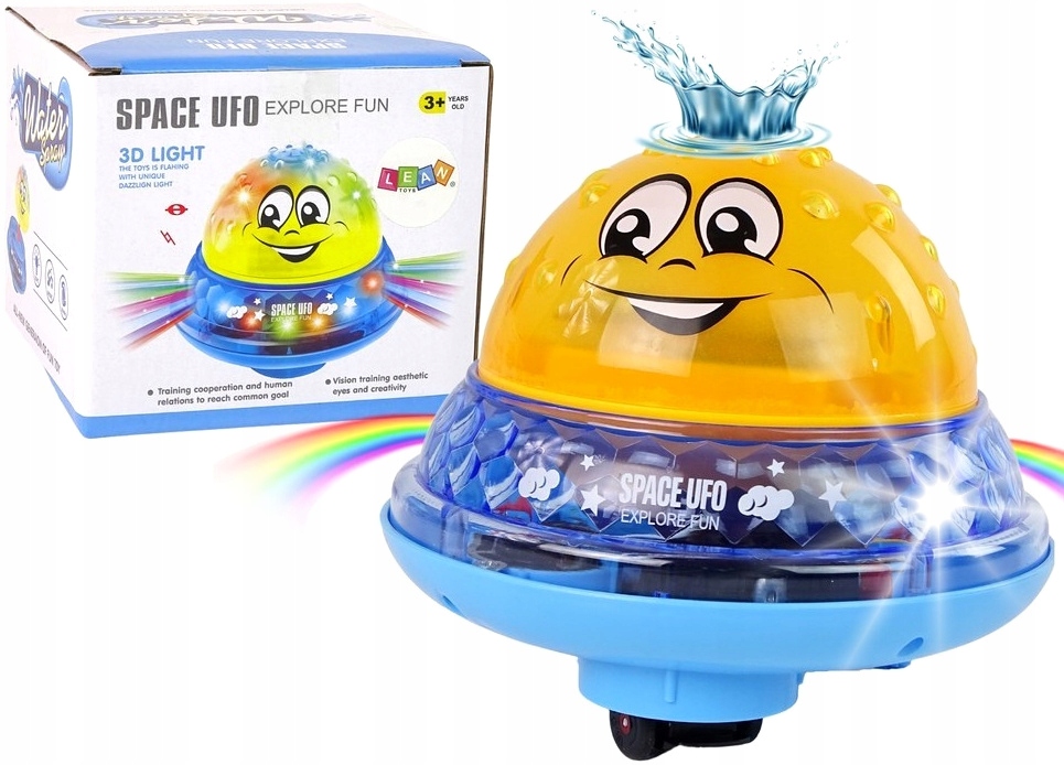 Іграшка з двох частин ідеально підходить для використання вдень і вночі. Куля жовтого кольору і має вгорі отвори, з яких виходять струмені води. Просто покладіть їх на поверхню води, і вода почне хлинути. Після всіх розваг у ванні ви можете перейти до кімнати, де вас чекає невелика пластина у формі НЛО. Коли поверхні кулі та пластини зближуються, включається музика та спрацьовують кольорові світлодіоди. Невелика дискотека в кімнаті малюка. Час повеселитися!