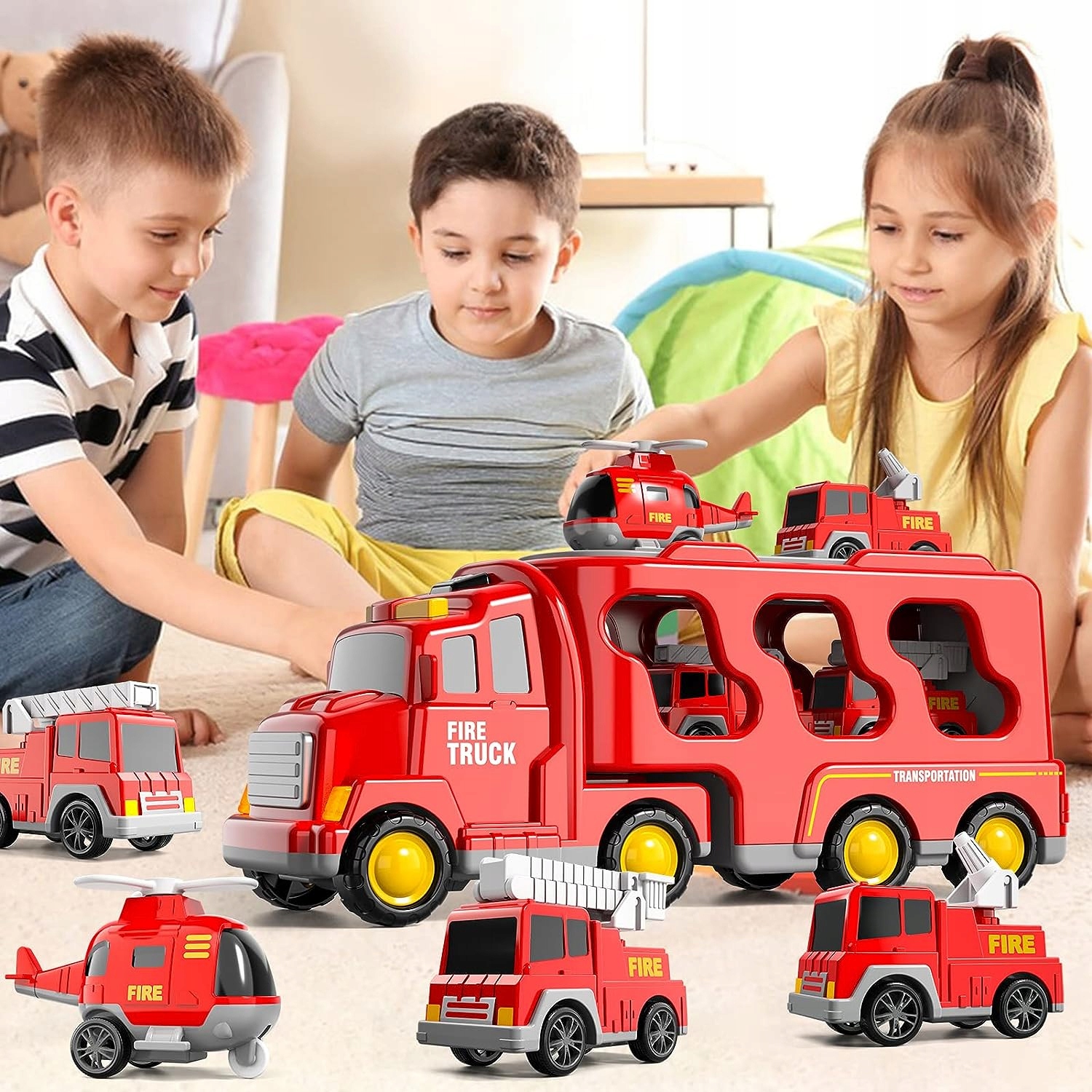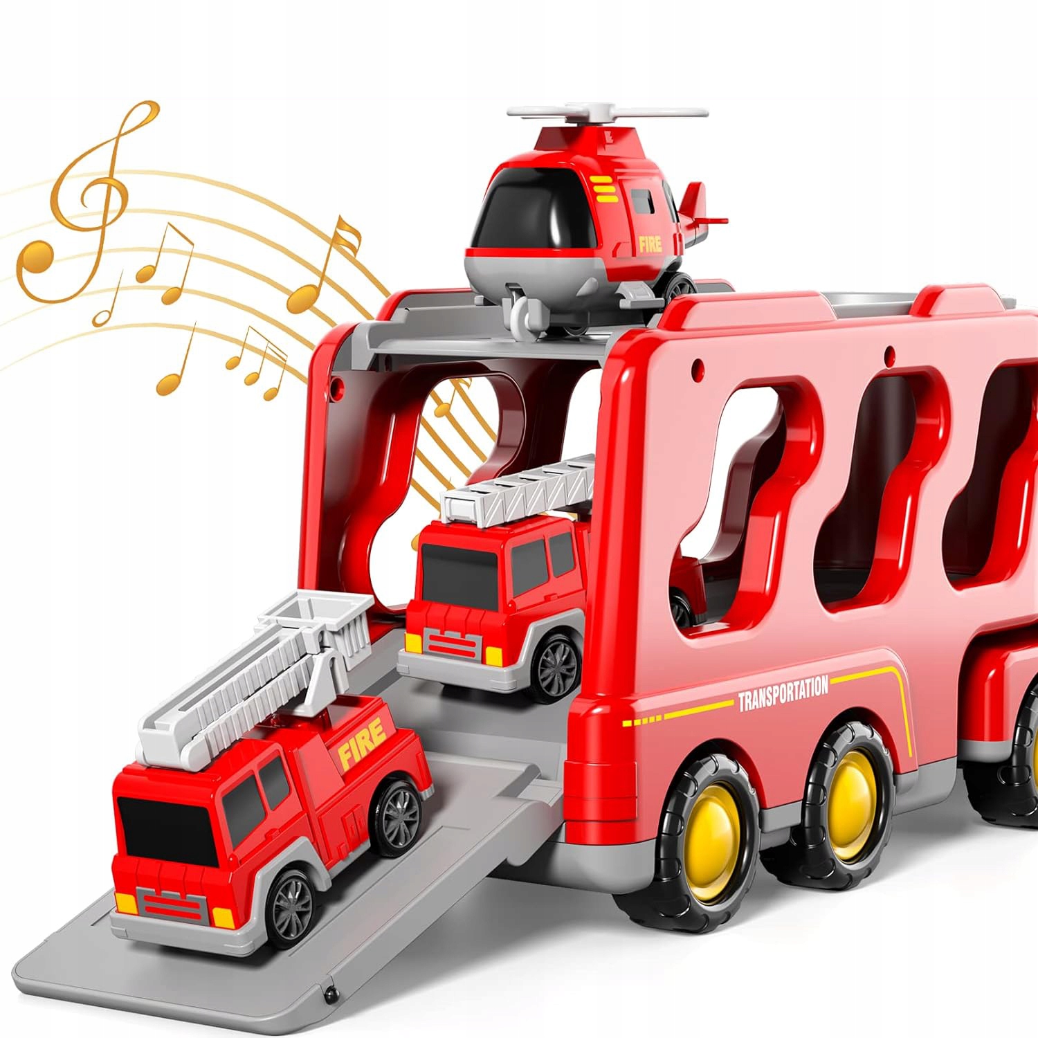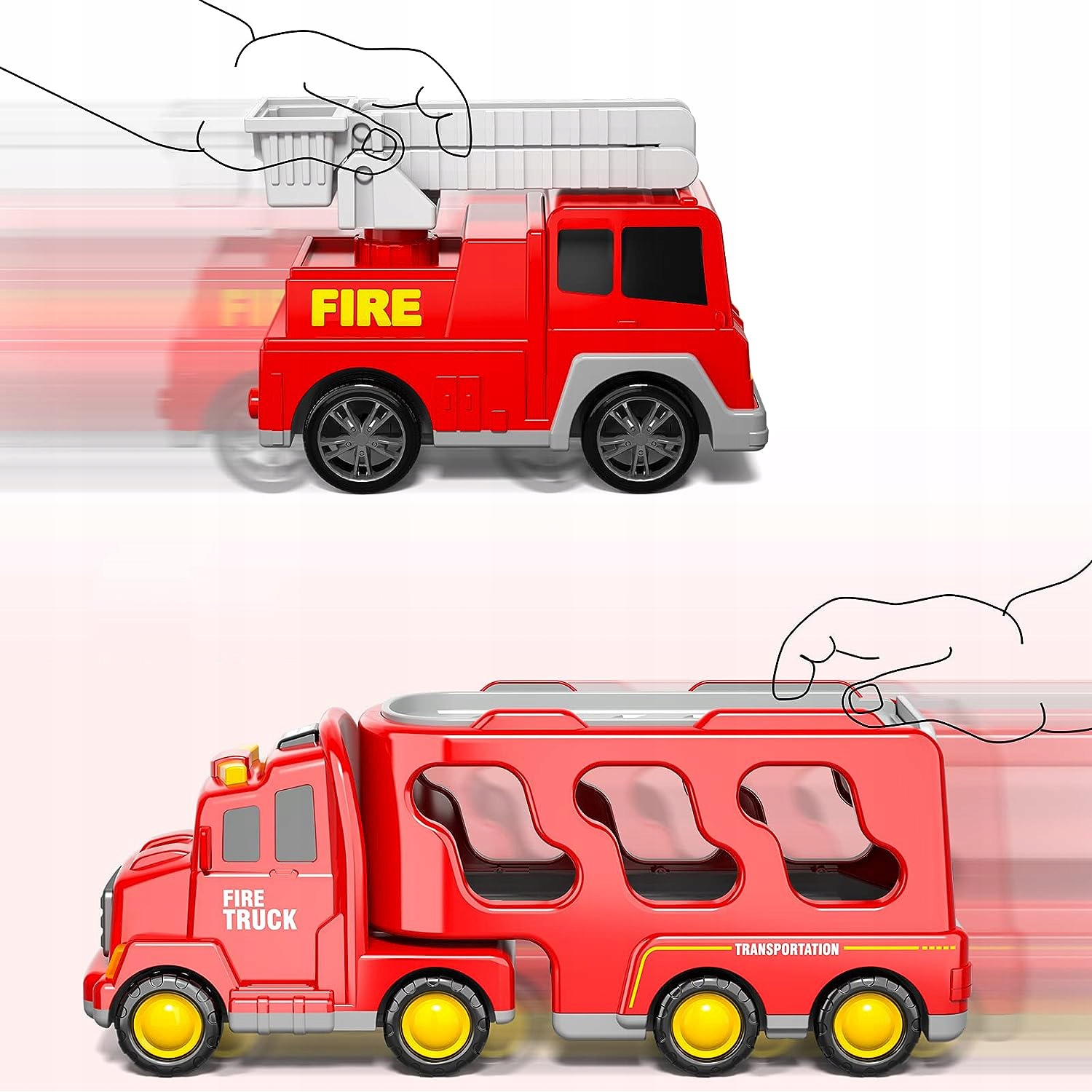 - 🚒Призначений для маленьких любителів пожежогасіння, включає більший транспортний засіб і 6 маленьких автомобілів (пожежна машина, автодрабина, гелікоптер, спринклерна машина, автомобіль і позашляховик).