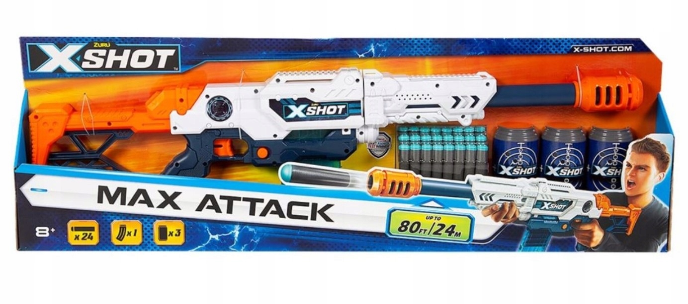 У набір входить гвинтівка MAX ATTACK, 24 дротики, магазин і три банки.
