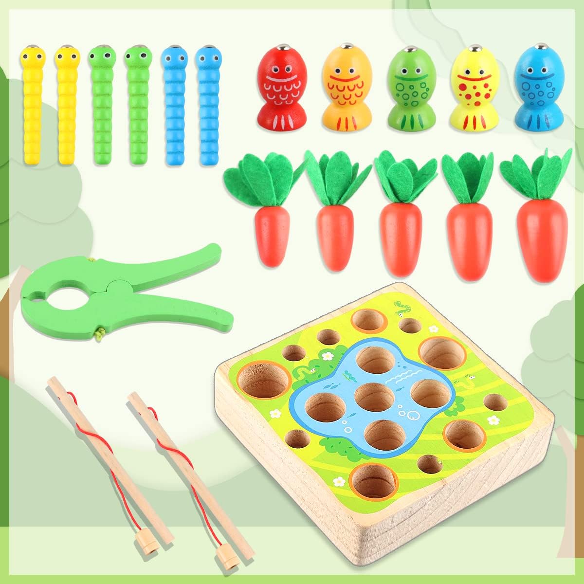 👍 👍 【3 в 1】 Цей дерев’яний набір іграшок містить риболовлі ігри, пов’язані з риболовлею, збиранням моркви та ловлячими глистами. 3 різні ігри забезпечують маленьким дітям сенсорні вправи та різноманітні розваги.