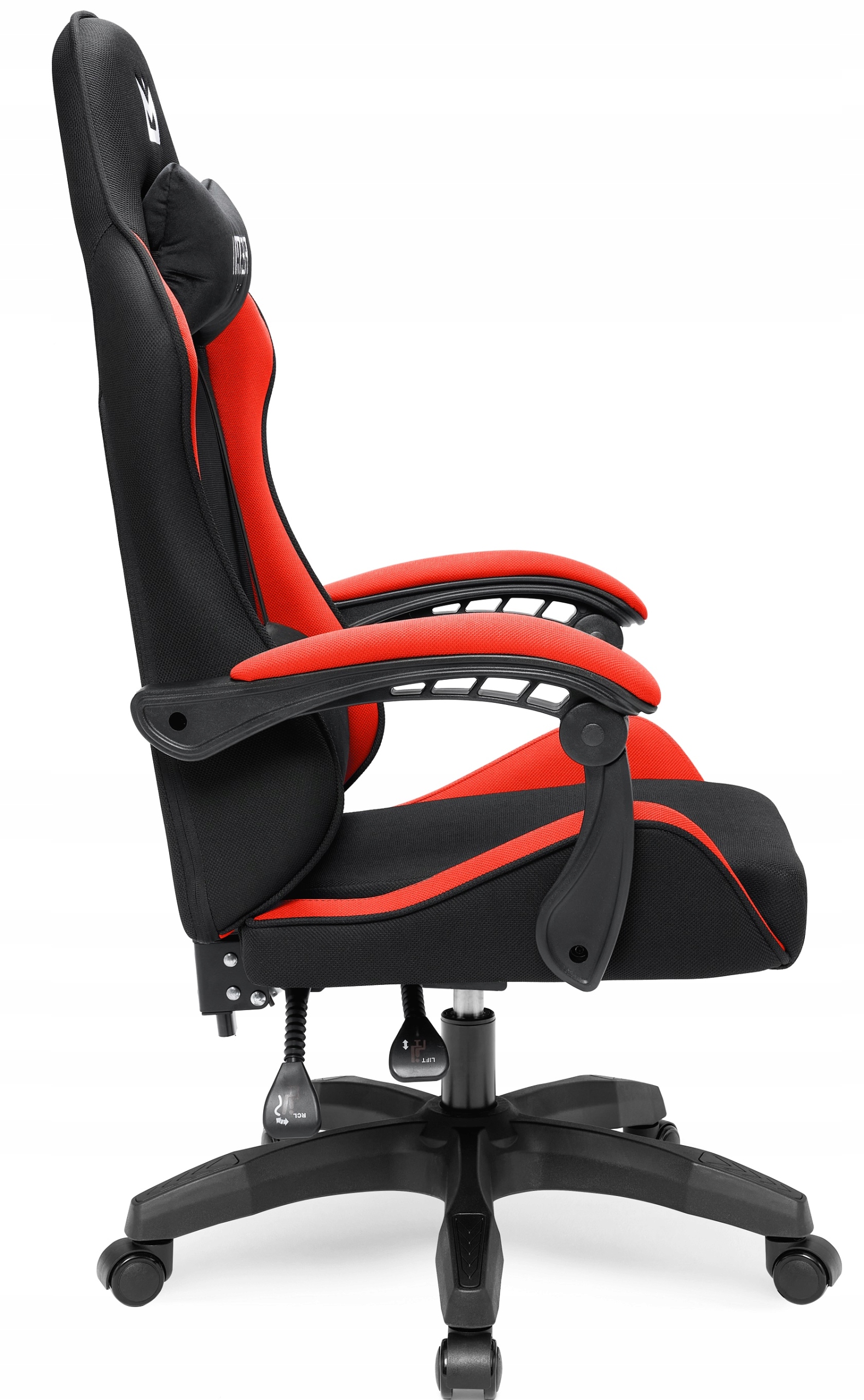 Ігрове крісло виготовлено з матеріалу. Поєднання червоного і чорного надає йому унікальний характер. Соковиті червоні елементи з боків привертають увагу, а чорний центр сидіння і спинки обмежує видимість можливого бруду. Ця модель підійде як стілець для дівчинки чи хлопчика. Він поєднується з меблями подібного кольору, але також може бути цікавим контрастом до білих офісних приміщень - особливо тому, що логотипи на кріслі цього кольору.