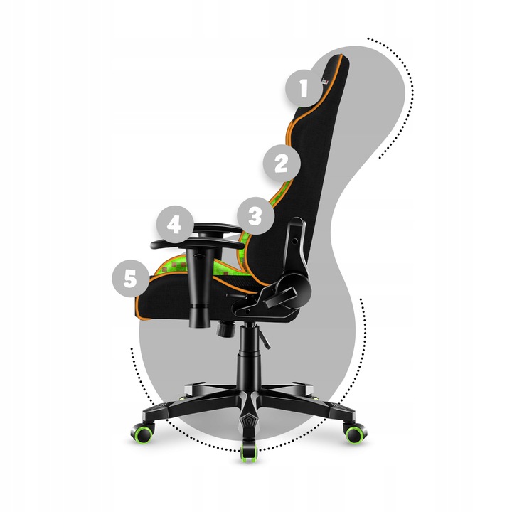 Матеріал, який використовується для подушок, а також для верхніх і бічних частин крісла, складається з багатьох переплетень, забезпечує правильну циркуляцію повітря, дуже міцний і водночас приємний на дотик. Але його довговічність — це половина успіху, і що найбільше вражає, так це малюнок комп’ютерних пікселів, розроблений спеціально для Ranger. Стиль наймодніших комп'ютерних ігор для дітей тепер доступний у вашому кріслі!