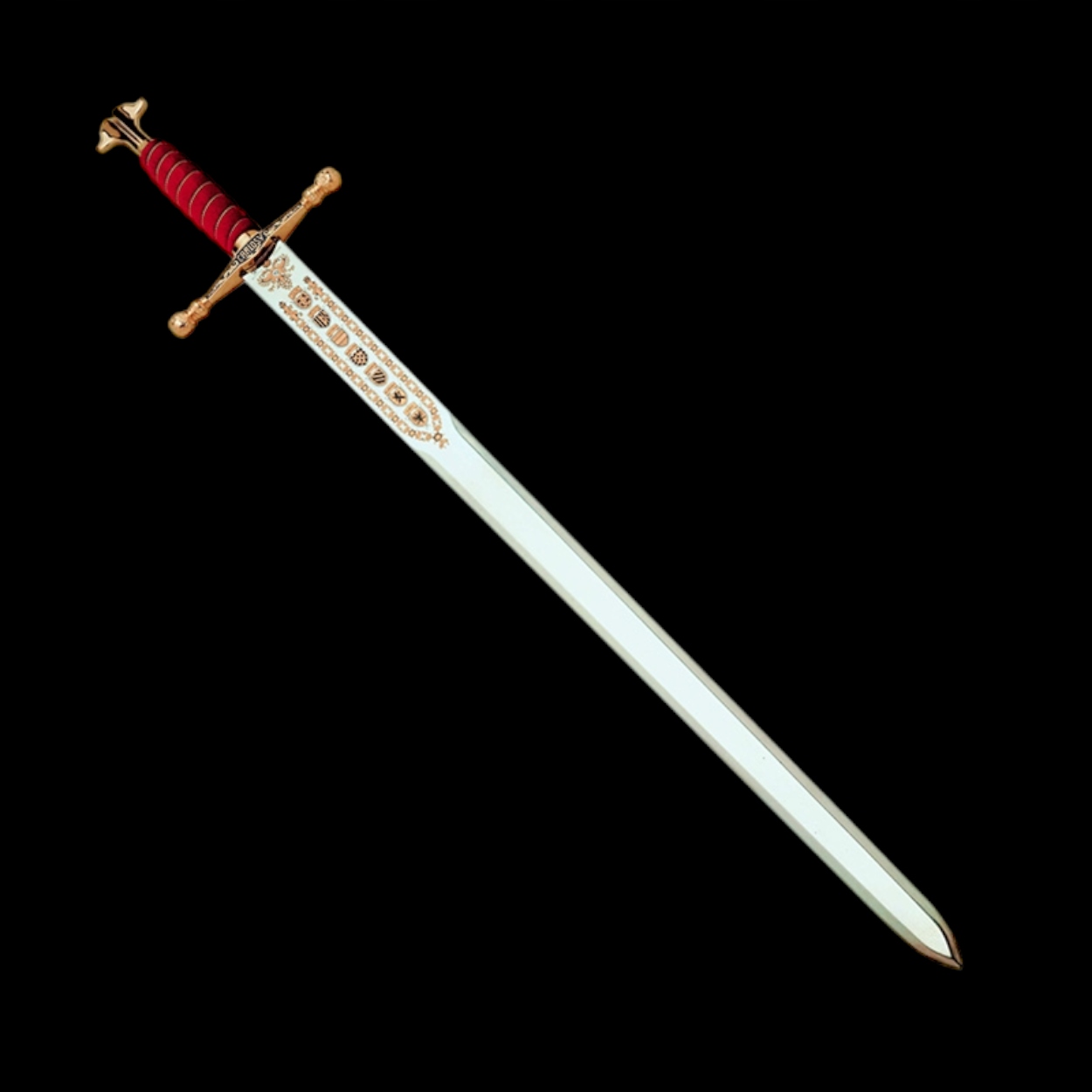 Дворучний меч з довгим клинком, викуваним зі сталі найвищої якості та прикрашеним латунними вставками. Довга ручка дозволяє тримати меч двома руками. Латунна головка у формі серця. Латунна поперечина з рукавами, обробленими латунними ковпаками. Древко обмотане червоною замшею та латунним дротом.