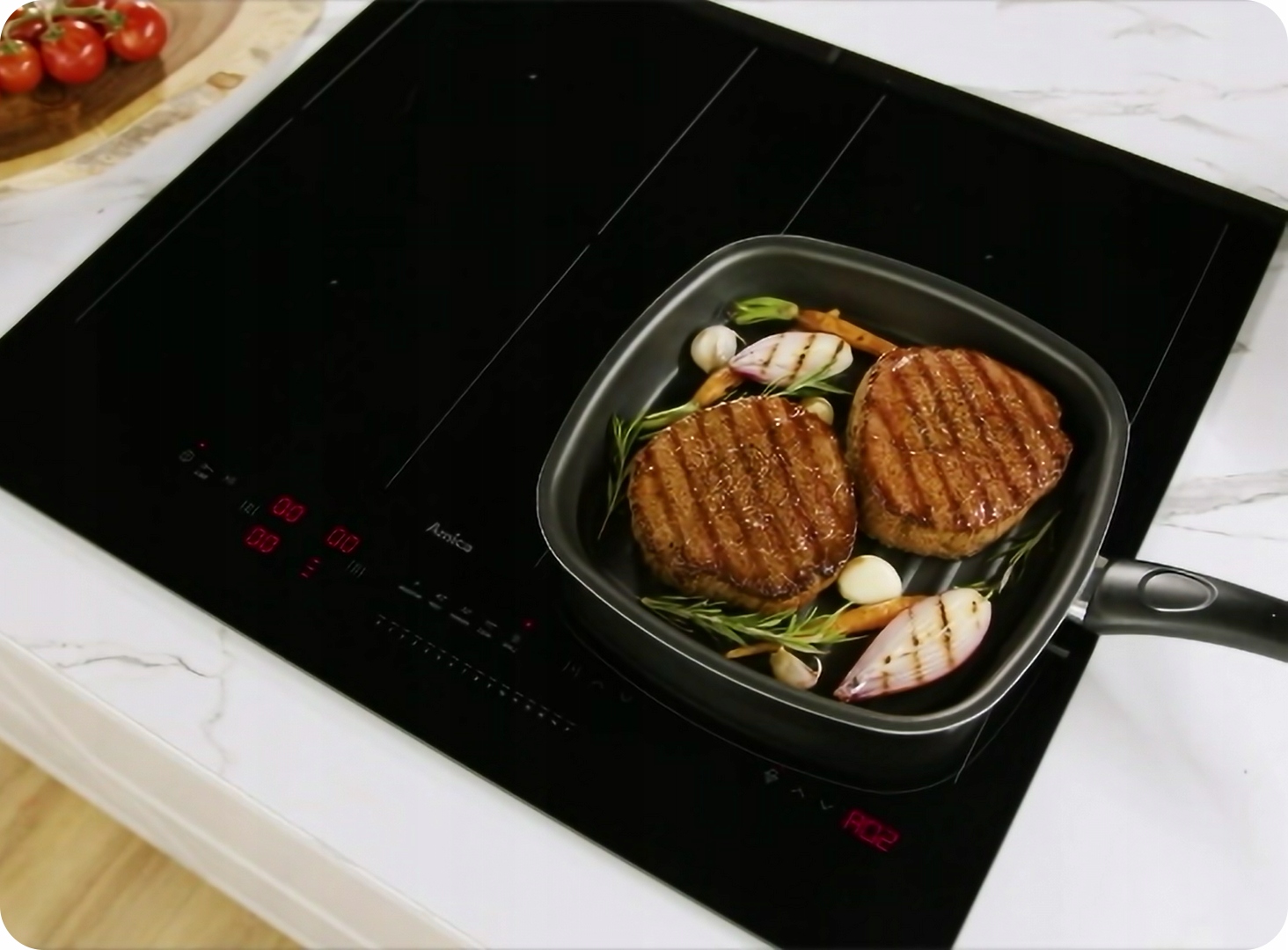 Кухня відповідає останнім трендам? Так, якщо ви виберете універсальну індукційну плиту Amica! Ви можете встановити його практично в будь-яку стільницю - навіть у стільницю товщиною всього 12 мм над ящиком і в стільницю 28 мм над духовкою Amica. Сучасний дизайн варильної панелі не вимагає використання передньої вентиляції або перегородки, тому ви можете використовувати простір під плитою по максимуму. Там можна навіть зберігати гострі аксесуари, адже дно тарілки додатково захищене. Все це означає гнучкість у дизайні кухні, комфорт використання та унікальний дизайн.