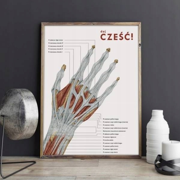 Анатомічний постер руки з написом Give Hiце проект Marta Pawelec, популярного серед лікарів художника-графіка. На дошці зображено анатомію кисті з тильної сторони. Графіка виконана в сучасному та мінімалістичному стилі, який пасуватиме до будь-якого інтер’єру, надаючи йому характеру та більш професійного вигляду. Плакат для офісу має розмір 50см х 70см, тому відповідає універсальному формату В2. Елементи, що складають анатомію кисті, правильно підписані відповідно до латинської номенклатури.
