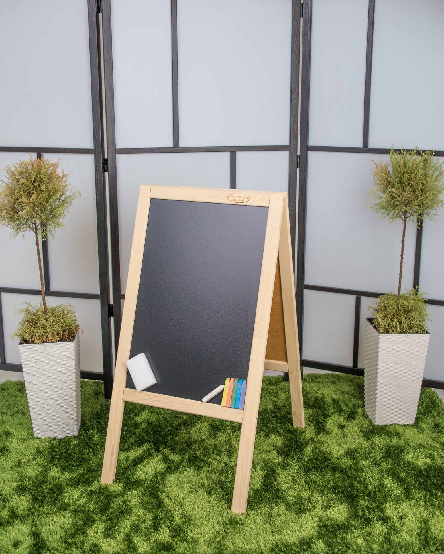 Двостороння рекламна вивіска виготовлена з HDF плити, яка виконує функцію крейдяної дошки, та дерев'яної рами. Стопор має ланцюжок, який запобігає його розгортанню.