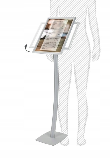 Матеріал кадру: алюміній; Ширина профілю: 25 мм; Тип кута: нахил; Формат вставки: A3 (297 х 420 мм); Виконання: вертикально / горизонтально; Колір кадру: анодоване срібло; Тип захисної плівки: антирефлексна версія з ультрафіолетовою стабілізацією