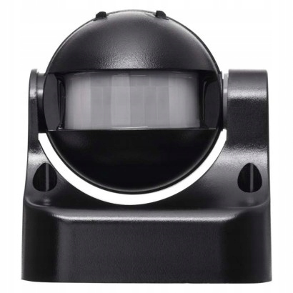 Чорний датчик рухуз вертикальним регулюванням у діапазоні 180 градусів, корисний для автоматичного керування освітленням чи іншими електричними пристроями. Датчик можна встановлювати як у приміщенні, так і на вулиці. Однак у разі зовнішнього встановлення він повинен бути належним чином покритий, наприклад, дахом. Висота установки датчика над землею повинна бути не менше 2 метрів. Датчик дуже чутливий до бічних рухів. Освітлення вмикається за допомогою датчика руху PIR, який працює в інфрачервоному діапазоні. Радіус дії ІЧ-детектора 12 м.