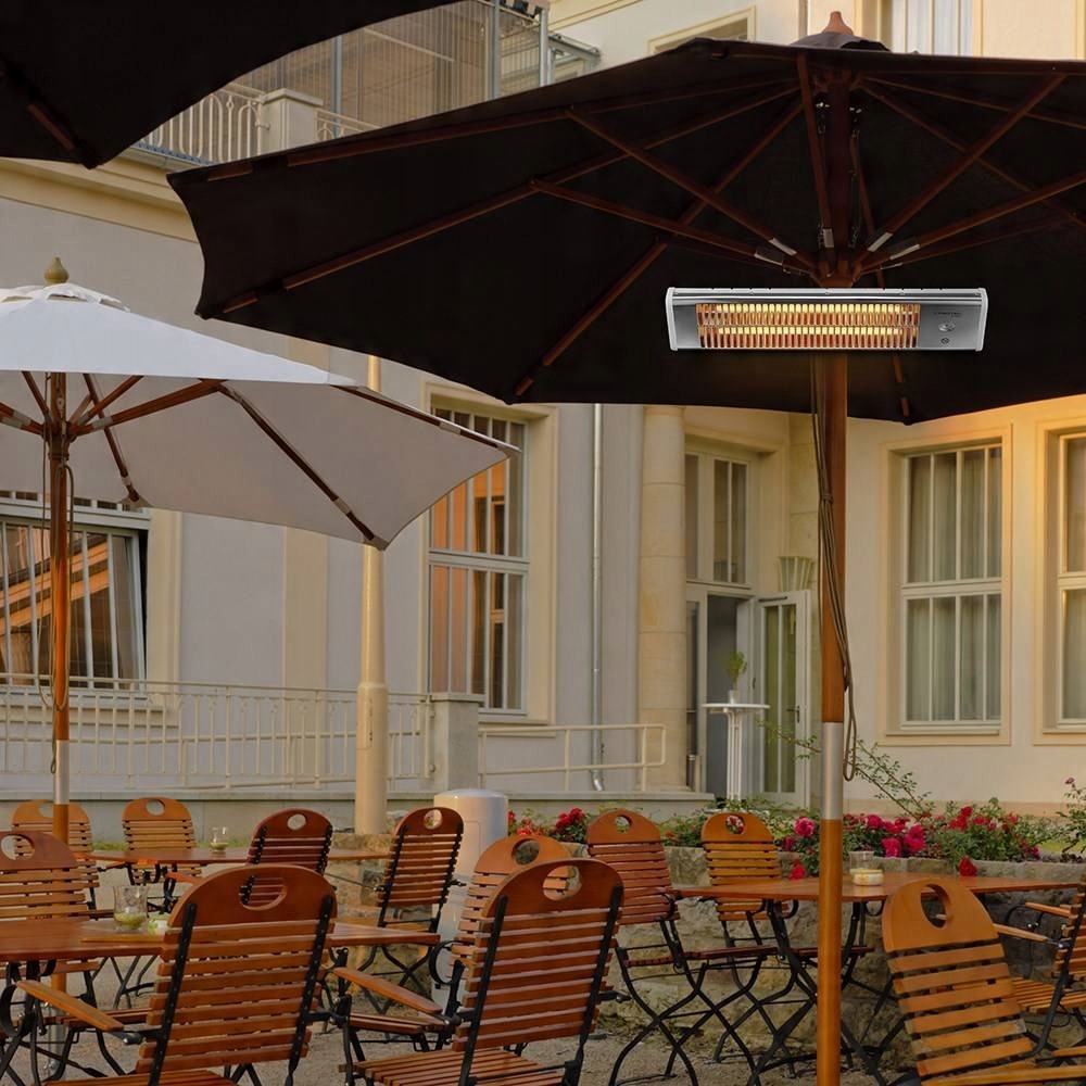 Кварцовий обігрівач IR 1200 S оптимально розроблений для короткочасного точкового нагріву без тривалої фази запуску. На балконі, критій терасі або в закладах громадського харчування: цей практичний універсальний пристрій генерує пряме тепло за допомогою інфрачервоного випромінювання та природного явища сонячного тепла. Це приємне тепло для всього навколишнього середовища відразу після ввімкнення.