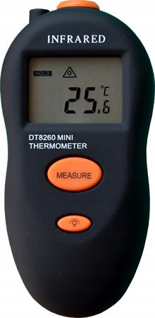 Міні інфрачервоний термометр, який використовується для вимірювання температури двигунів внутрішнього згоряння, систем кондиціонування повітря та акумуляторних батарей. Бездротова та безконтактна технологія забезпечує максимальну безпеку при вимірюванні температури. Просто наведіть датчик на джерело тепла і натисніть кнопку, і результат вимірювання автоматично відобразиться на екрані термометра. Таймер автоматичного вимкнення зменшує споживання батареї, вимикаючи термометр після 15 секунд невикористання. Великий РК-дисплей дозволяє легко читати вимірювання. Термометр живиться від двох батарейок ААА. Спеціальний режим дозволяє користувачеві читати та запам'ятовувати максимальні та мінімальні значення вимірювань.