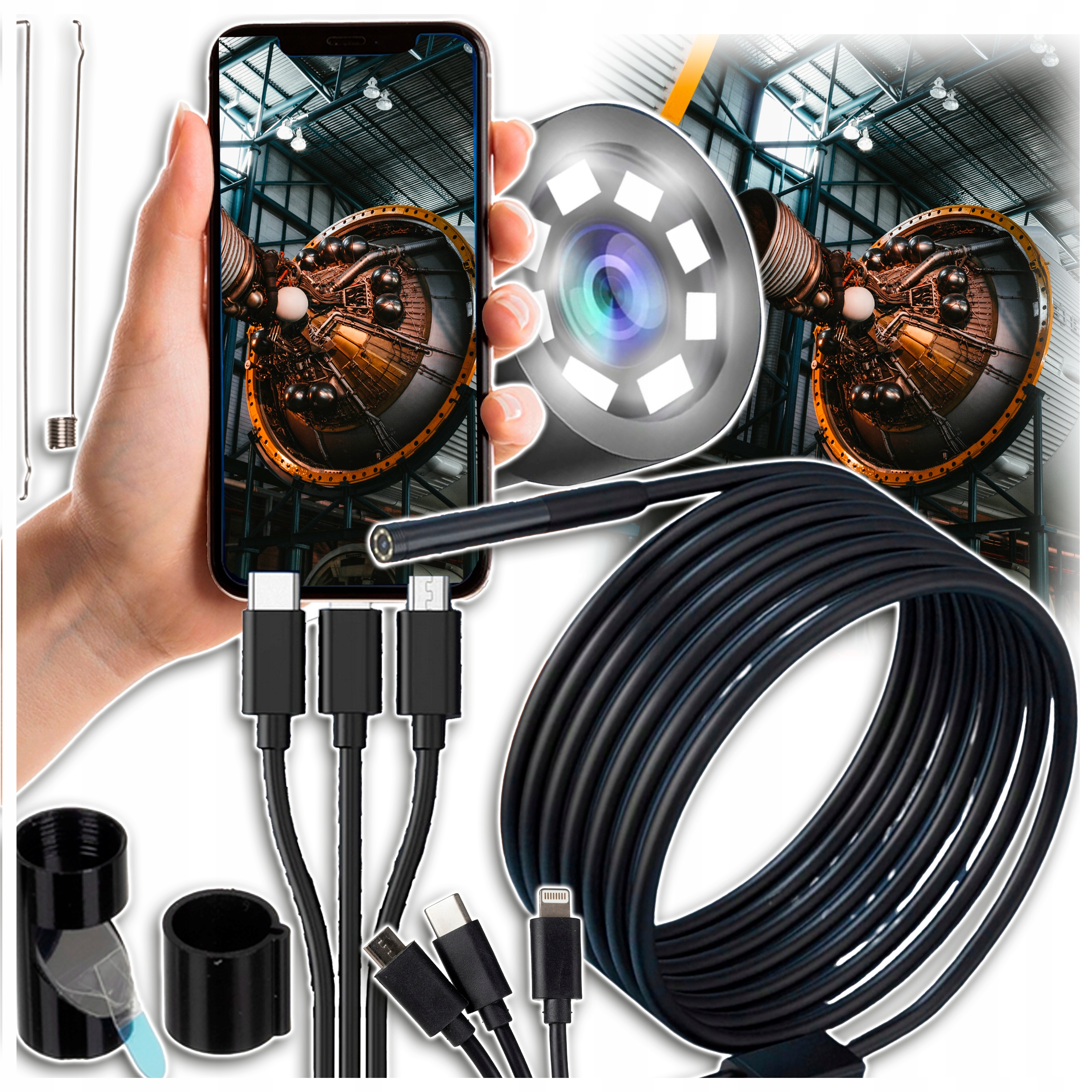 - 3 поради в наборі - камера має 3 замінні поради. Кожен з них має різну функцію (гачок, магніт, дзеркало). Камера підключена кабелем на 2 -метри, який є відносно гнучким і довговічним. Ви можете легко дістатися дуже важко, щоб дістатися до місць і побачити, що є причиною вини. 4 Додаток працює на таких системах, як Android та iOS. У камері є 3 поради щодо телефону, такі як: microous, блискавка та USB -C.