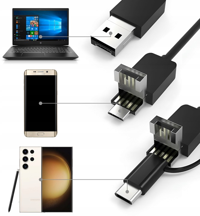 Потім підключіть камеру ендоскопа до мобільного пристрою з універсальним 3in1 Plug (USB, MicroUSB, USB-C).Додаток автоматично виявляє підключену камеру і негайно запустить передачу зображення на екрані пристрою.