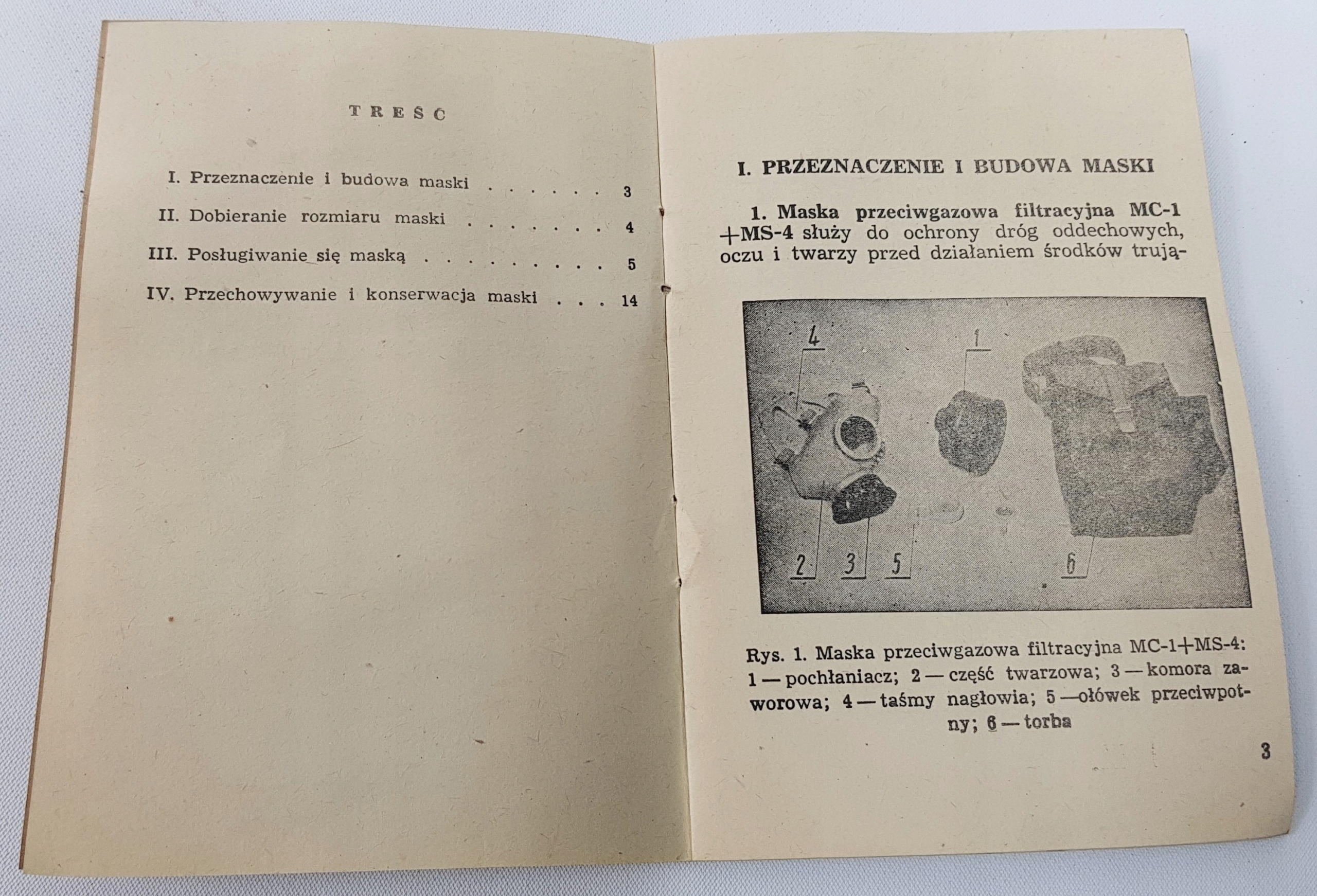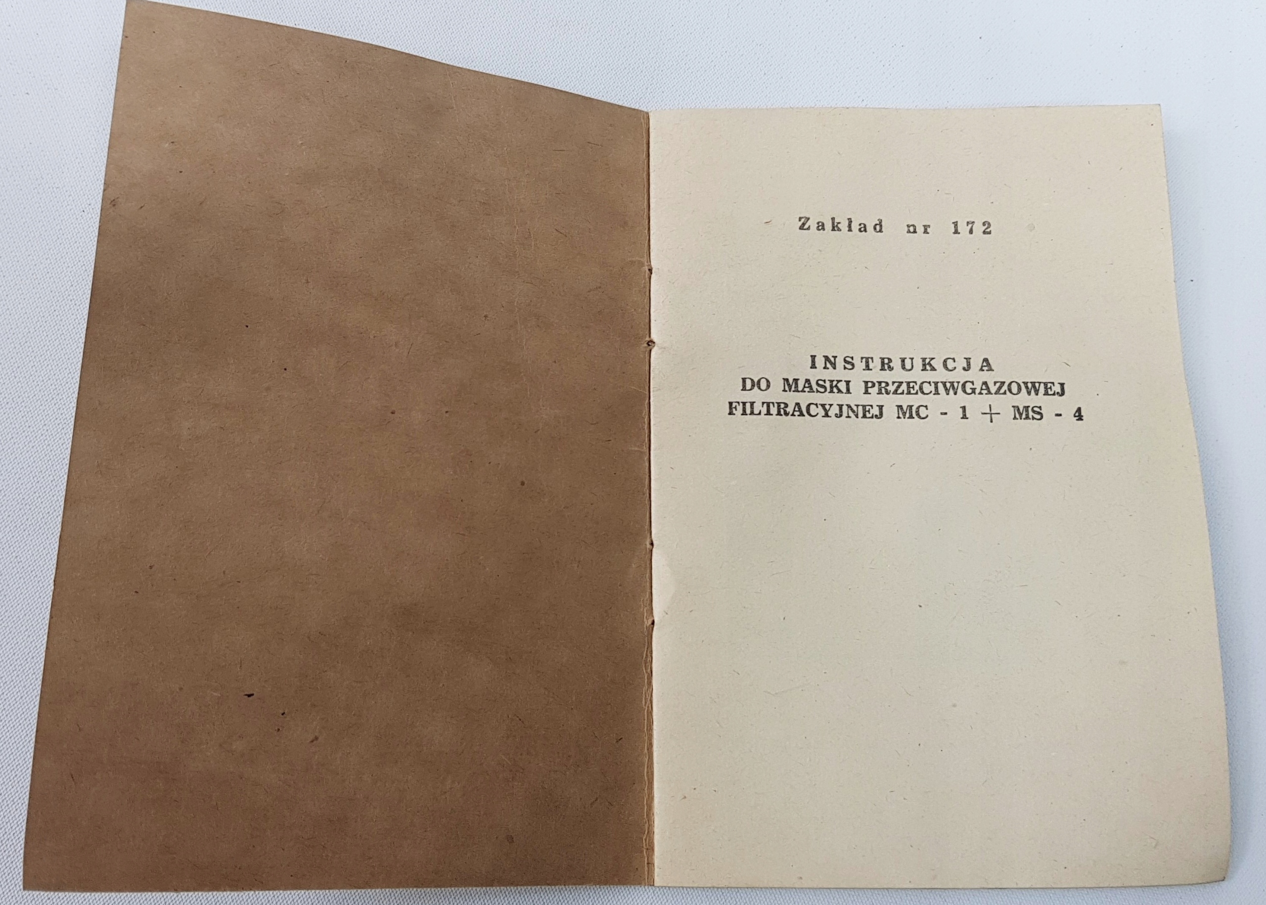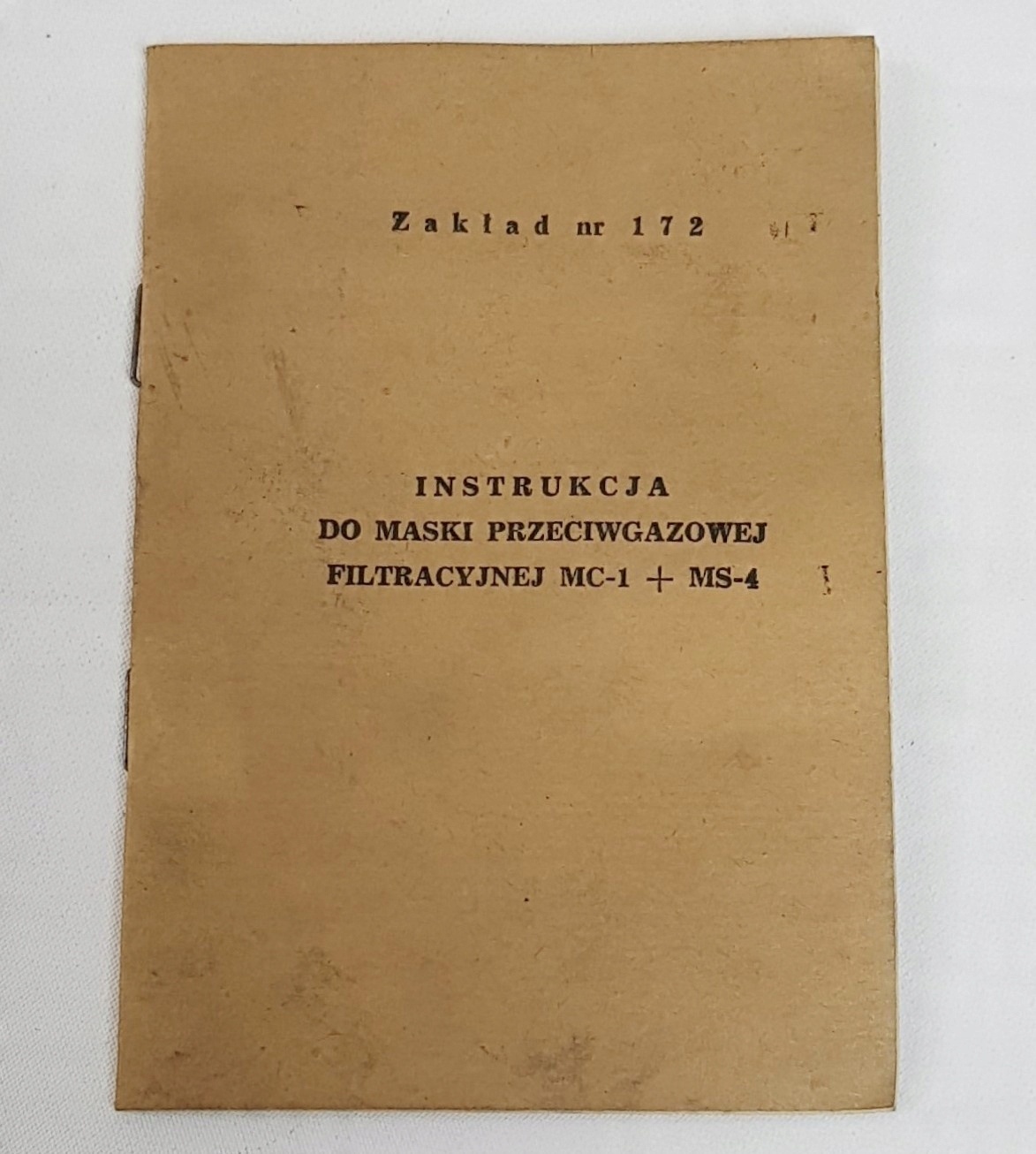 Оригінальна інструкція до протигазу фільтруючого типу MC-1+MS-4 у вигляді буклета на 15 сторінок з описом призначення та конструкцію маски, способи вибору розміру, використання маски та опис зберігання та догляду за маскою разом із малюнками та чорно-білими фотографіями.