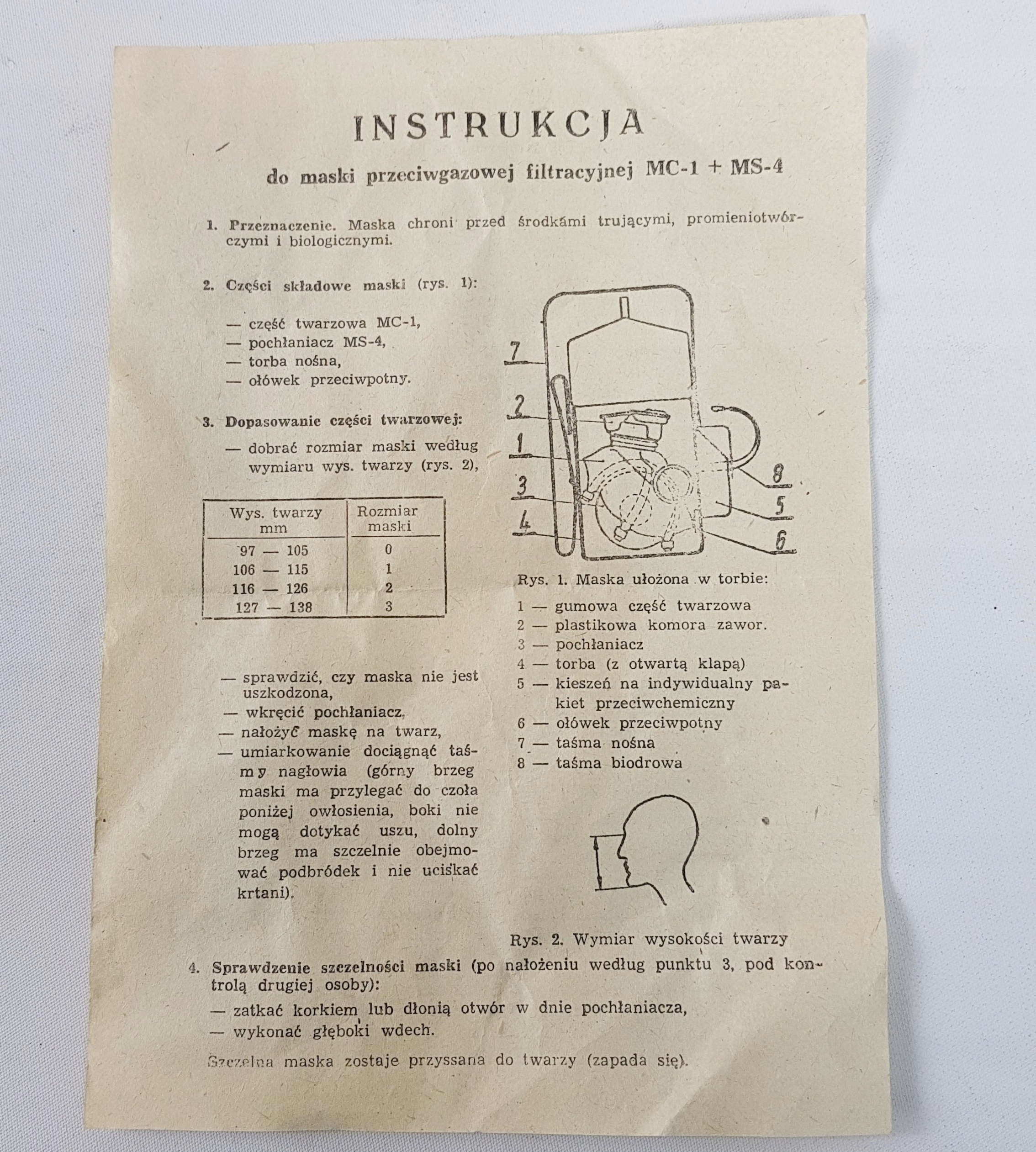 Оригінальна інструкція до протигаза MC-1+MS-4 у вигляді односторінкової листівки з описом призначення та конструкція маски, способи вибору розміру, використання маски та опис зберігання та догляду за маскою разом із малюнками та чорно-білими фотографіями.