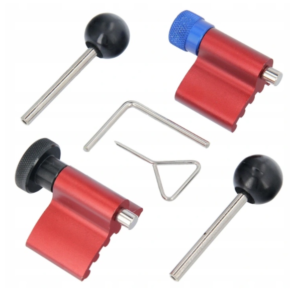 - Професійний пристрій для блокування зубчастих передач. Комплект дозволяє зафіксувати зубчасті колеса ГРМ в сервісному положенні при заміні ременя ГРМ. Спеціальна форма замків дозволяє точно встановити контрольні точки запалювання. Замки фіксують зубчасту передачу, колінчастий вал і натяжний шків ременя.