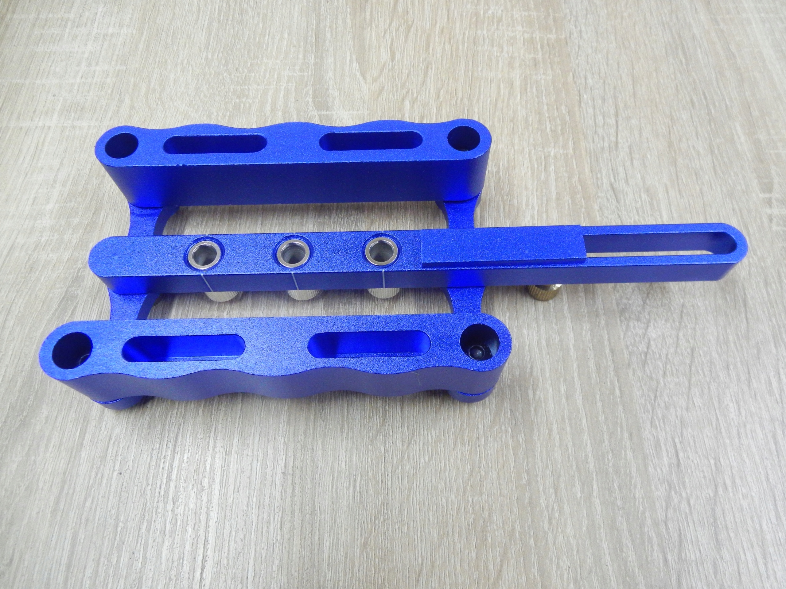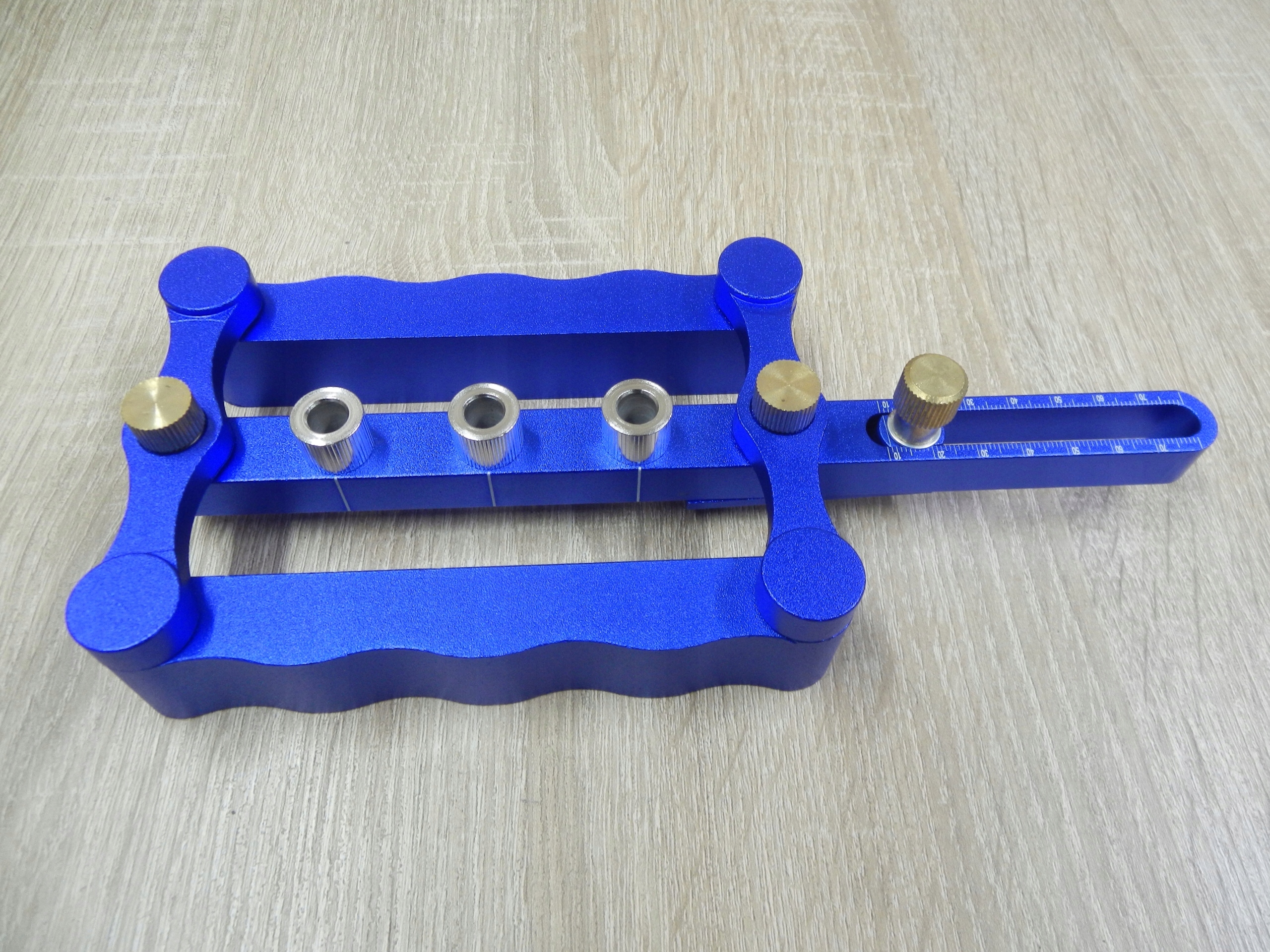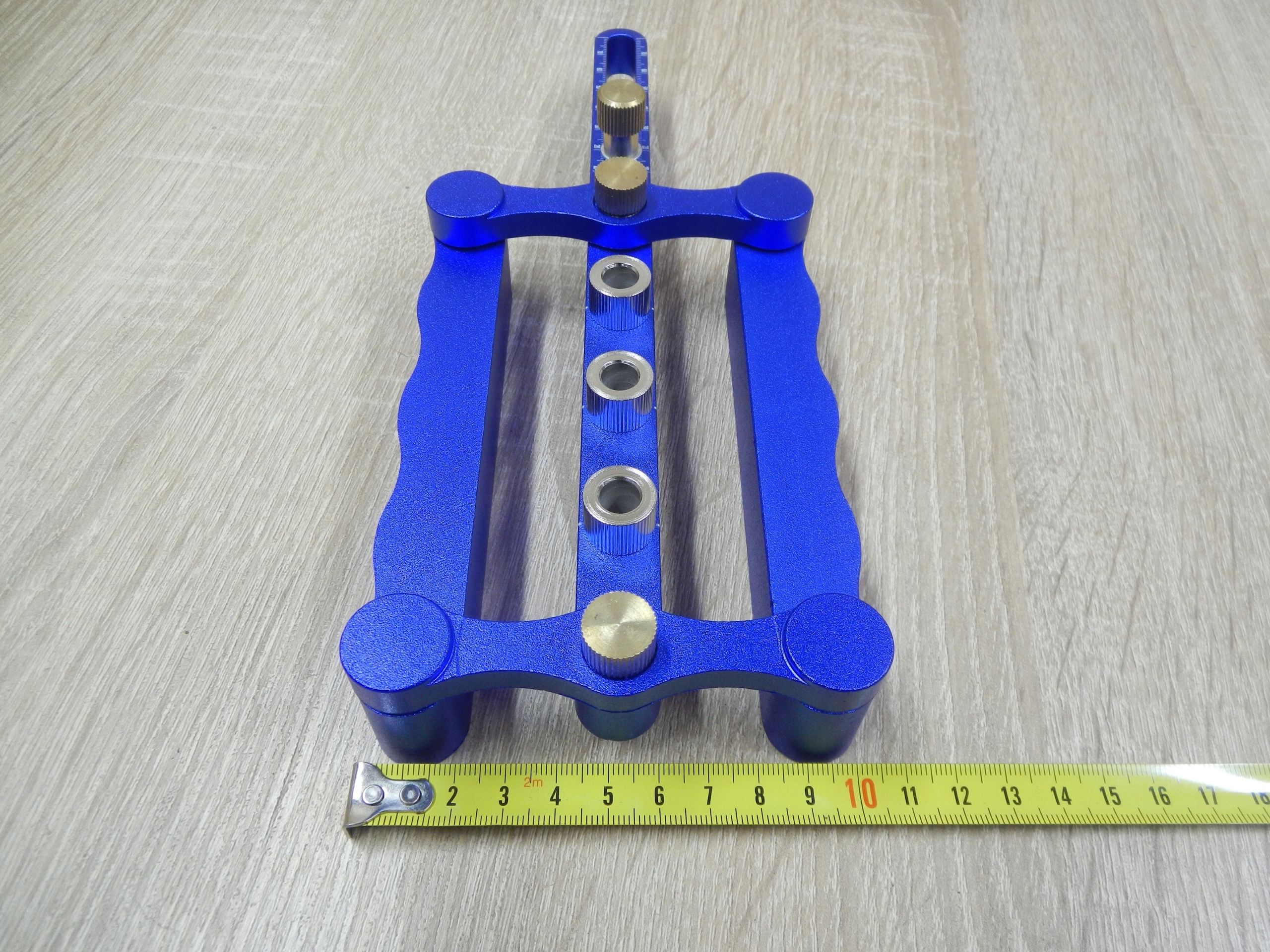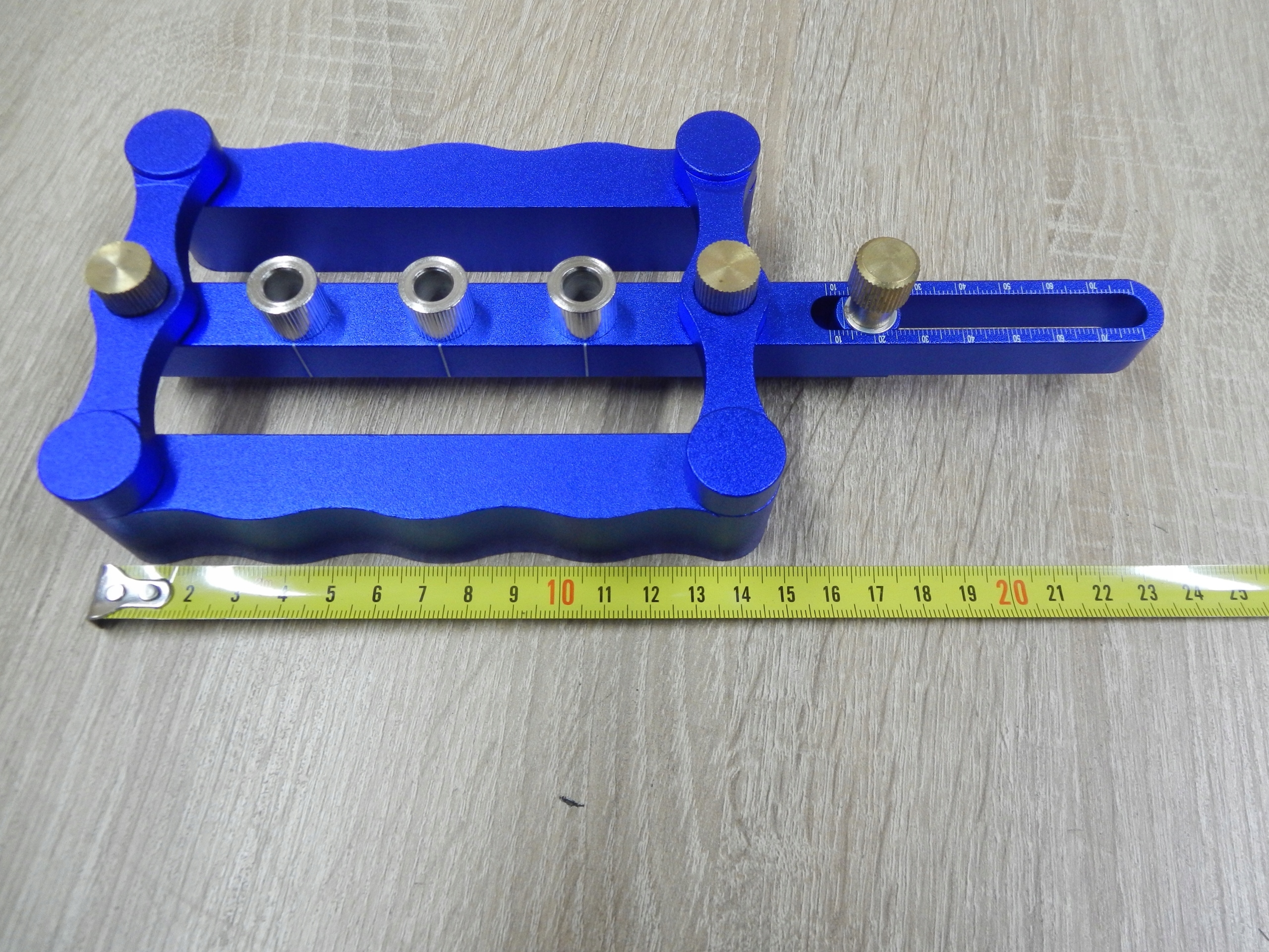Пристрій для виконання дюбельних з'єднань дерев'яних елементів з деревних матеріалів. Шаблон дозволяє робити отвори по краях і по площині. Корпус пристрою виготовлений з алюмінієвого сплаву, а утримувальні втулки із загартованої сталі.