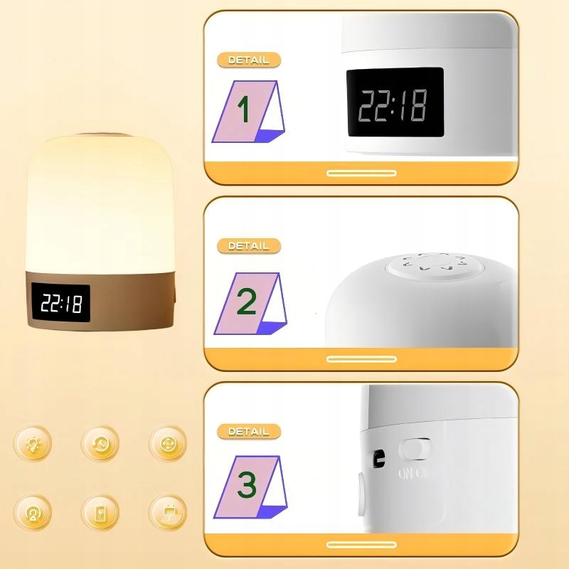 ⏰Нічник із відображенням часу, трьома налаштуваннями колірної температури, плавним регулюванням яскравості, функцією таймера, літієвою батареєю в комплекті, подвійним джерелом живлення (зарядка та підключення до розетки), підходить для широкого спектру застосувань.