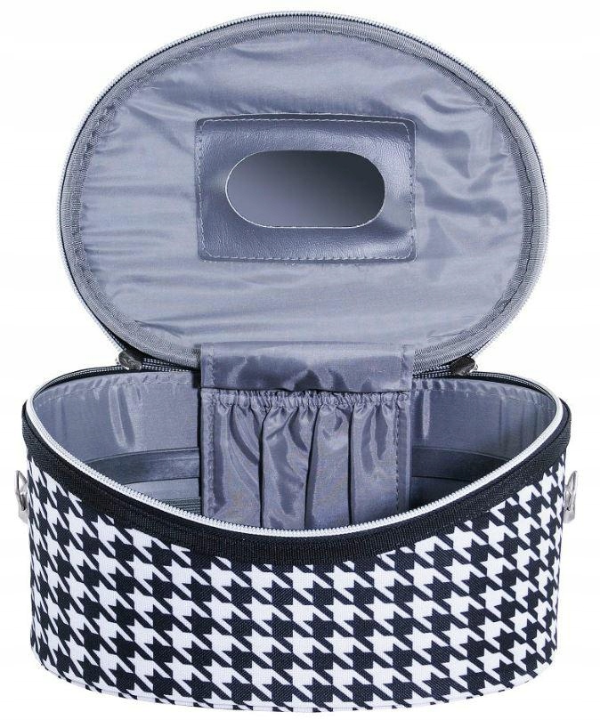 Скринька середнього розміру, ідеальна для подорожей, виготовлена з міцної тканини з модним малюнком гусяча лапка. Його овальна форма надає елегантного вигляду, а класичне поєднання білого та чорного робить його вибором для жінок, які цінують стиль і функціональність.