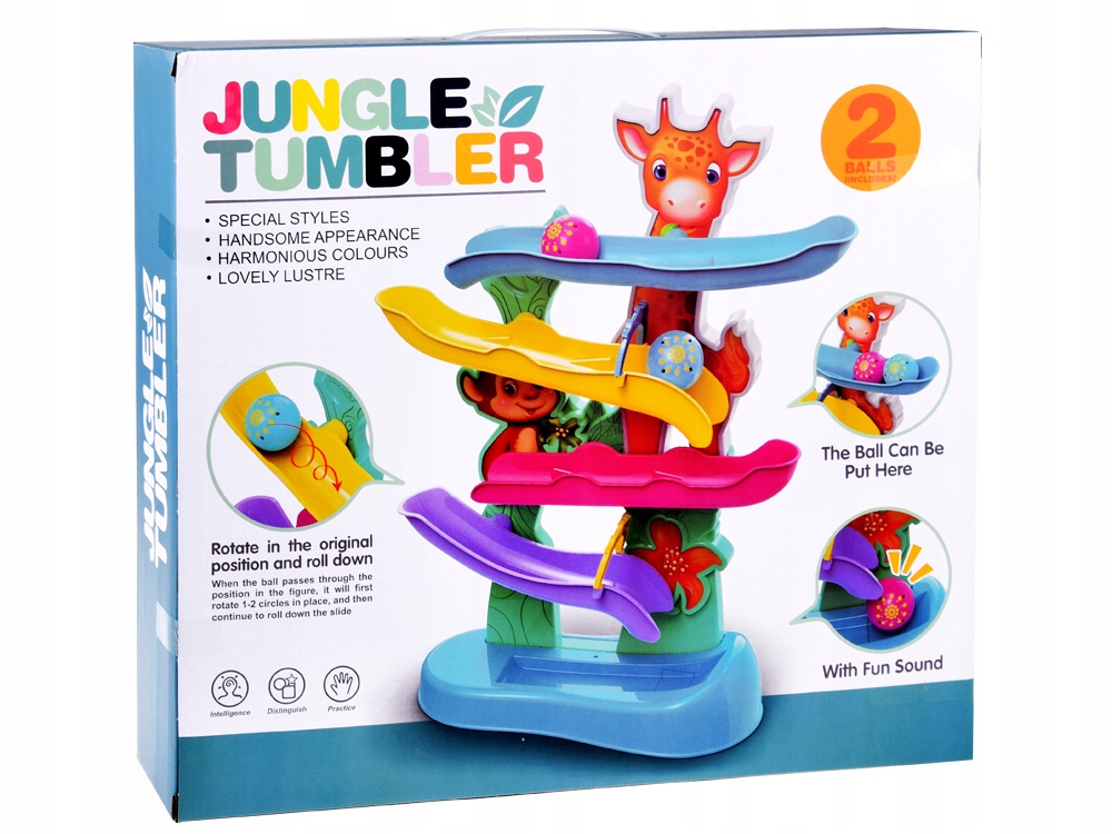 Барвистий м'яч у джунглях — інтерактивна іграшка для дітей від 12 місяців. Іграшкова доріжка має 4 різнокольорові рампи, по яких котиться рожево-блакитна кулька, а коли вона досягне дна, дитина почує веселий голос тварин джунглів разом із веселим звуком барабану.