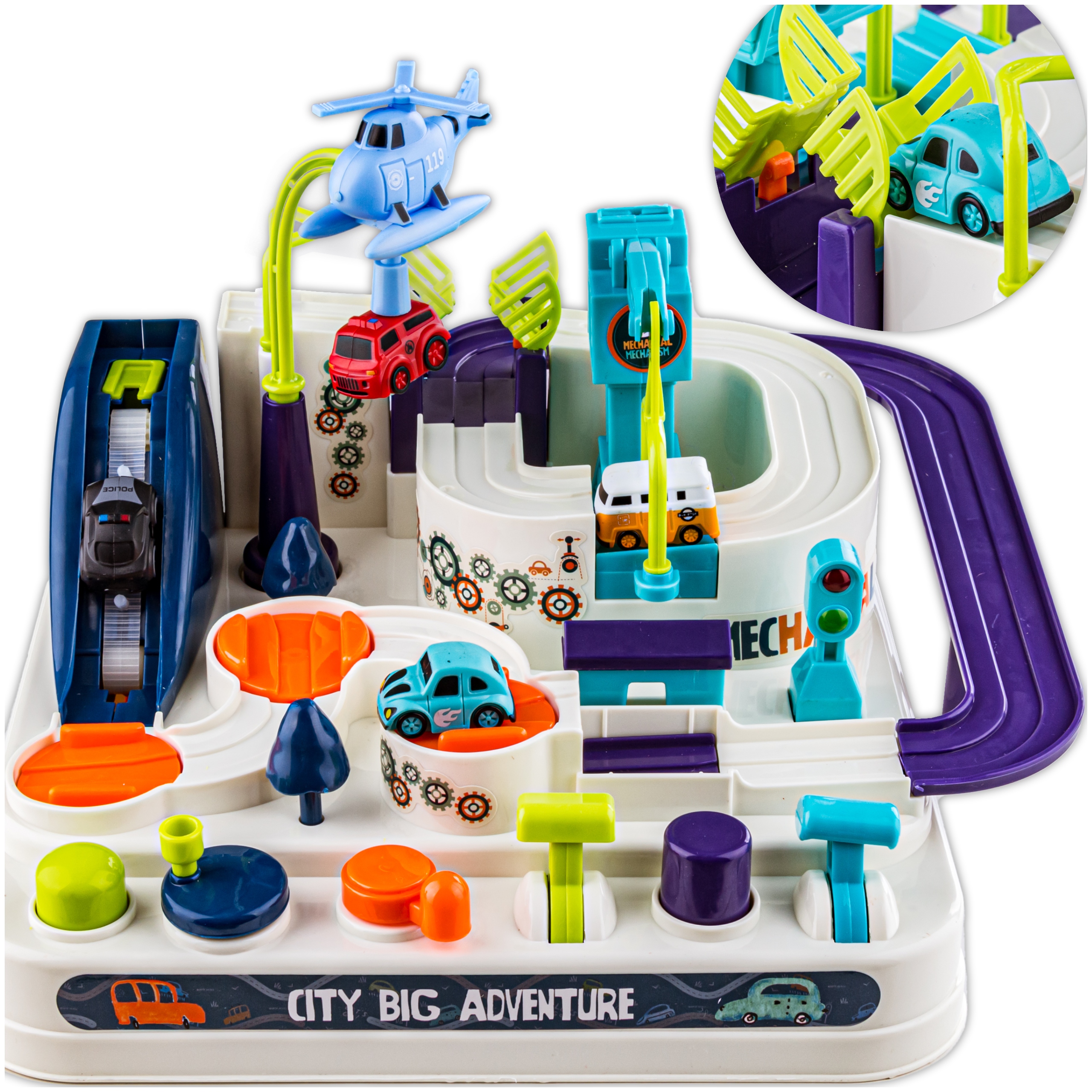 Транспортні засоби в наборі створені з думкою про маленьких дітей - вони не мають гострих країв, з ними можна грати і поза смугою перешкод. Машини мають металеві колеса під транспортним засобом - завдяки чому вони стійко тримаються на трасі. Набір містить 4 різні машини.